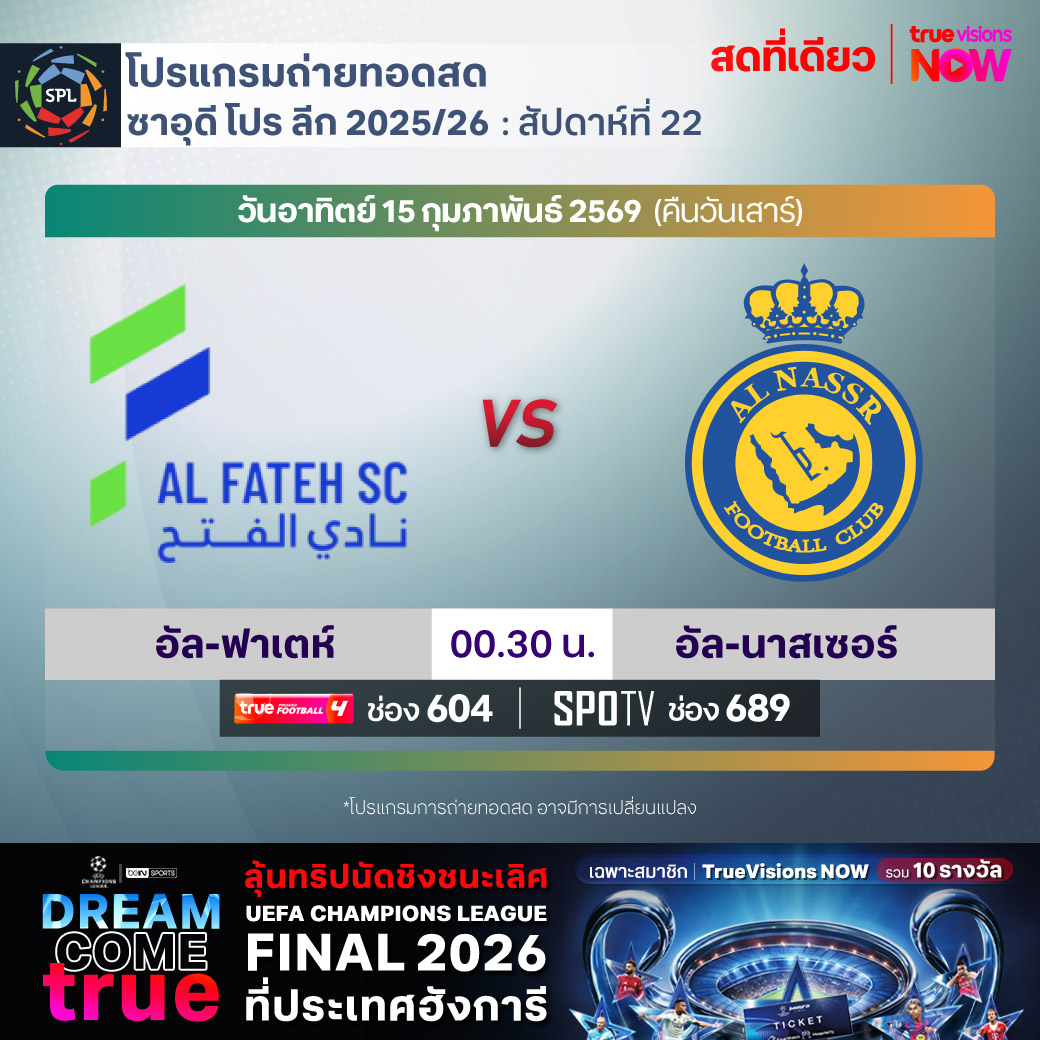 Al Fateh vs Al Nassr เวลา 00.30-02.30 ทางช่องTPF 4(604) / SPOTV (689)