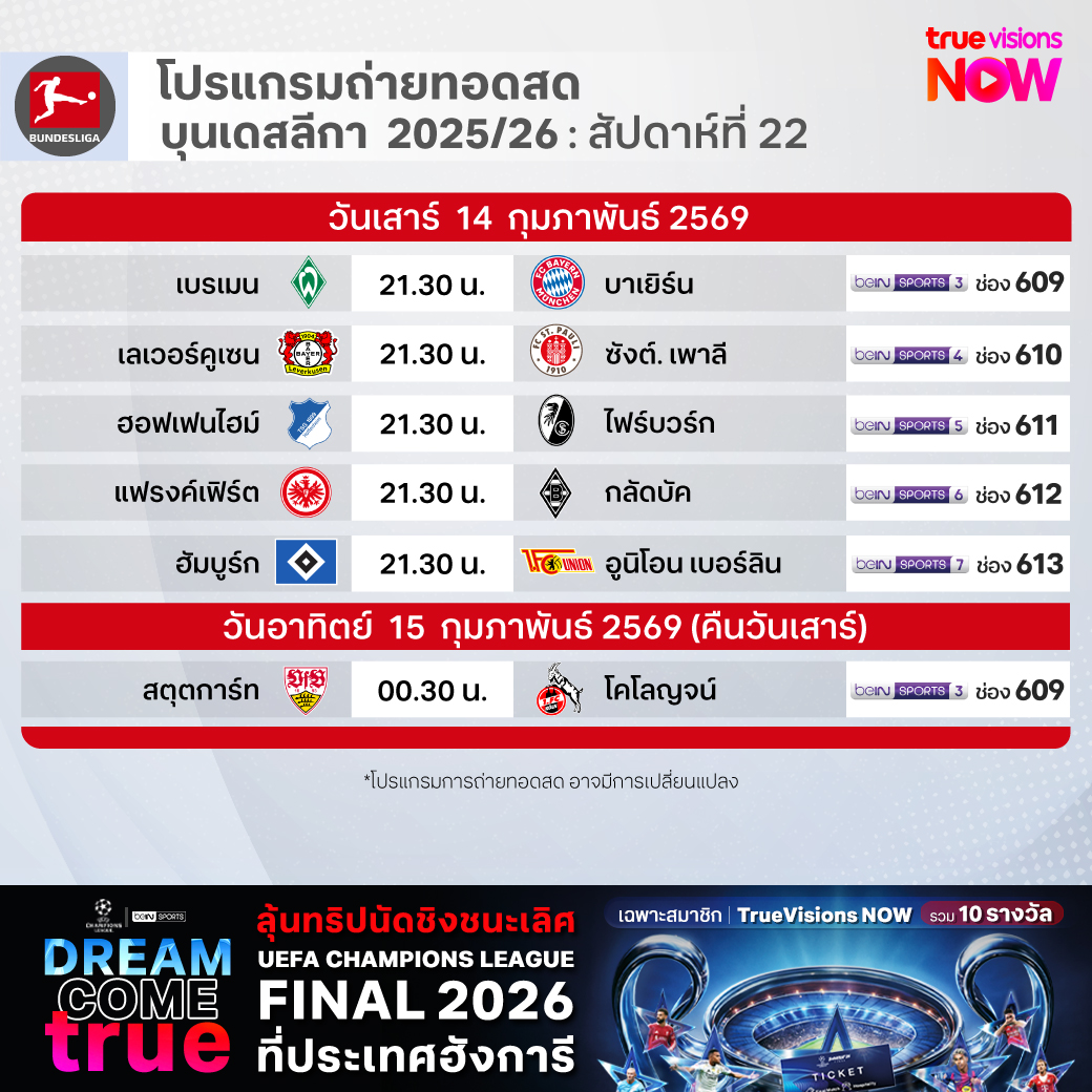 Werder Bremen vs Bayern เวลา 21.30-23.30 ทางช่อง beIN 3 (609)