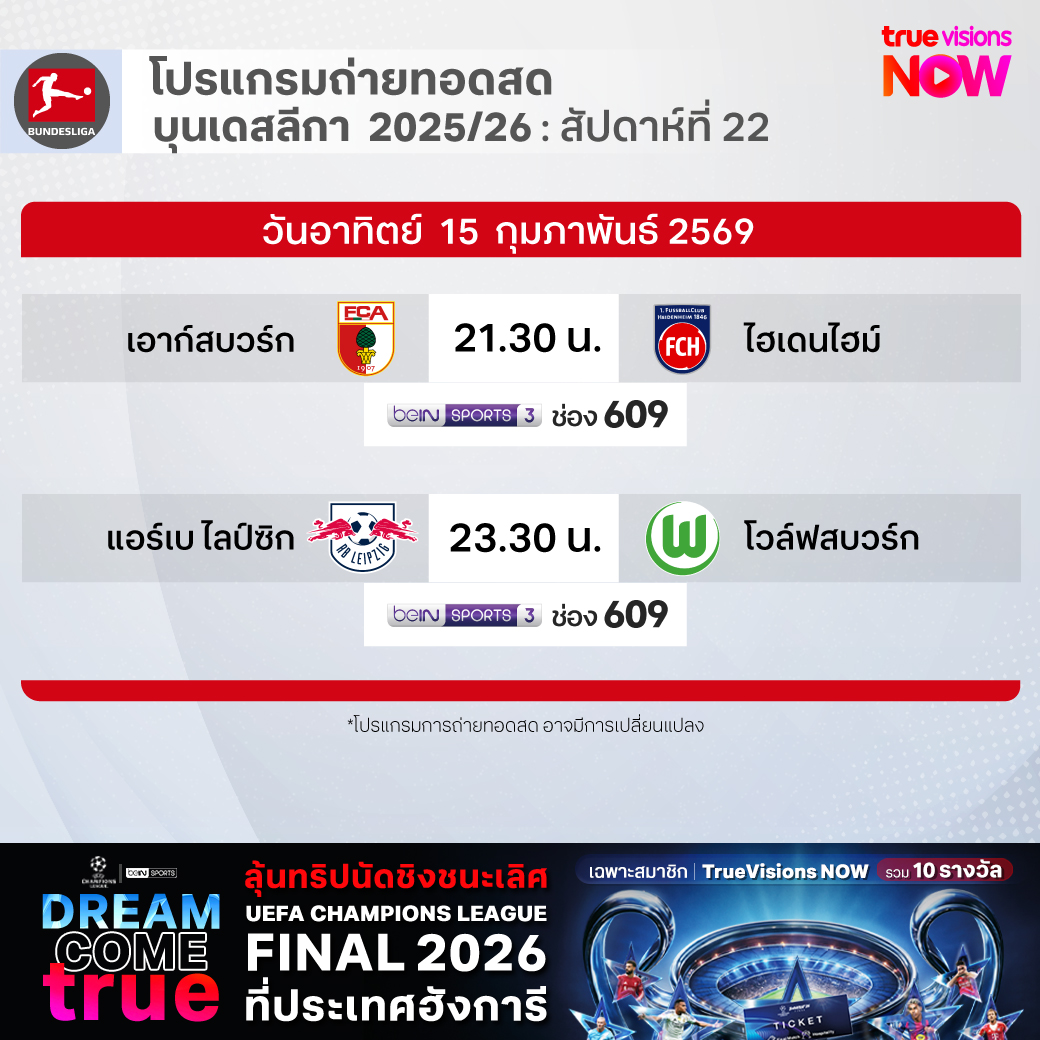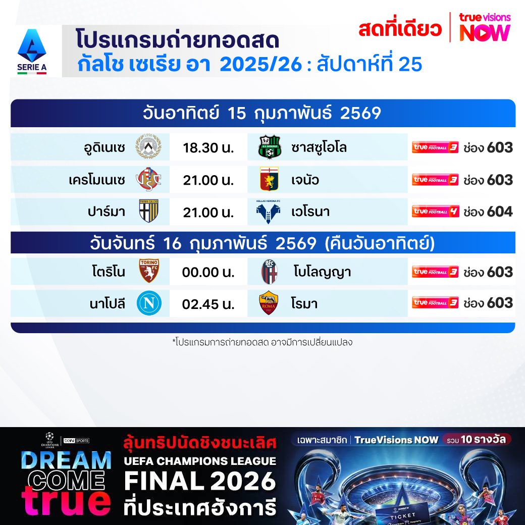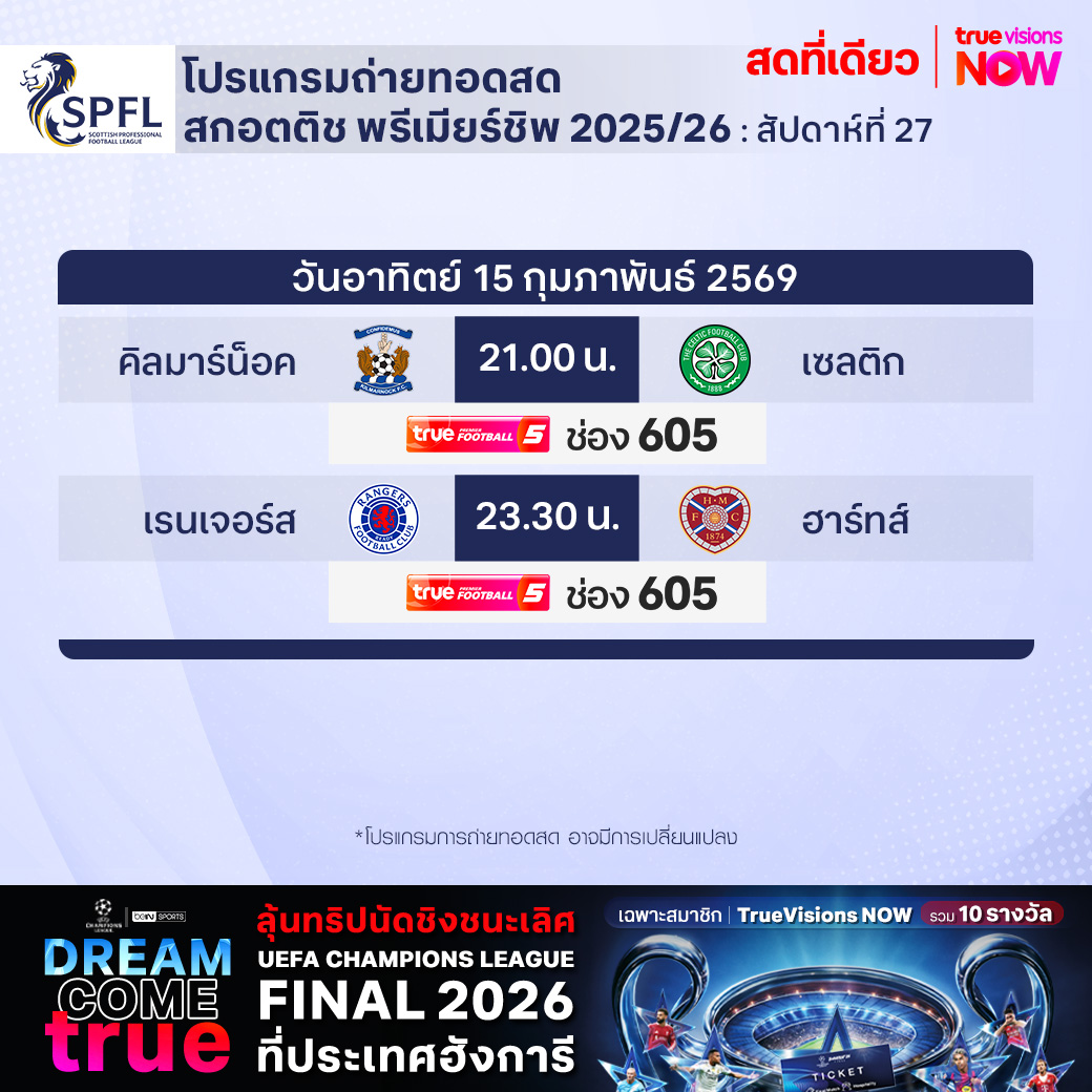 วันนี้มีอะไรดูที่ ทรูวิชั่นส์ ประจำวันอาทิตย์ที่ 15 กุมภาพันธ์ 69 ยังคงมีกีฬาที่น่าสนใจให้ได้ตามลุ้นตามเชียร์กันเหมือนเดิม โดยในส่วนของฟุตบอลยังมีศึก ลา ลีกา สเปน, บุนเดสลีกา เยอรมนี, กัลโช่ เซเรีย อา อิตาลี และ สกอตติช พรีเมียร์ชิพ ให้ได้ตามเชียร์กันต่อ ส่วนกีฬาอื่นๆ ยังมีการแข่งขันโอลิมปิกฤดูหนาว 2026, เทนนิสหญิง ดับเบิ้ลยูทีเอ ทัวร์ รายการ ดูไบ แชมเปี้ยนชิพส์, ลิฟ กอล์ฟ แอดิเลด, แบดมินตัน ทีมชายและทีมหญิง ชิงแชมป์ยุโรป, แบดมินตัน แบด เว็บ ไทยแลนด์ จูเนียร์ ทัวร์นาเมนท์, รักบี้ ซิกซ์ เนชั่นส์, มวยไทย ดิ อัลติเมท มวยไทย เอ็กซ์พีเรียนซ์, วอลเลย์บอล วี-ลีก และ วอลเลย์บอล ไทยแลนด์ ลีก งานนี้ ทรูวิชั่นส์ จัดเต็มให้ชมกันถึงบ้าน