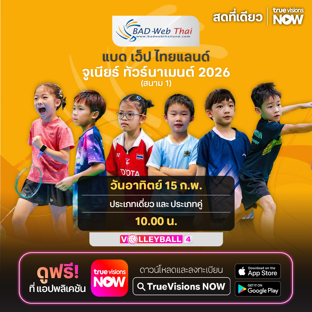 ไม่ชม ไม่เชียร์ ไม่ได้แล้ว เมื่อบรรดานักกีฬาอนาคตไกลระดับยุวชนทั้งชายและหญิง ตบเท้ามาร่วมการแข่งขัน รายการที่จะเป็น บันไดสู่การเป็นเส้นทางนักกีฬาอาชีพ และขวัญใจของชาวไทยในวันข้างหน้า สัปดาห์นี้ ติดตามการแข่ง แบด เว็ป ไทยแลนด์ จูเนียร์ ทัวร์นาเมนต์ 2026 ชมสด จุใจ ทั้งประเภทเดี่ยวและประเภทคู่ ชมและเชียร์ได้ที่ ทรูวิชั่นส์