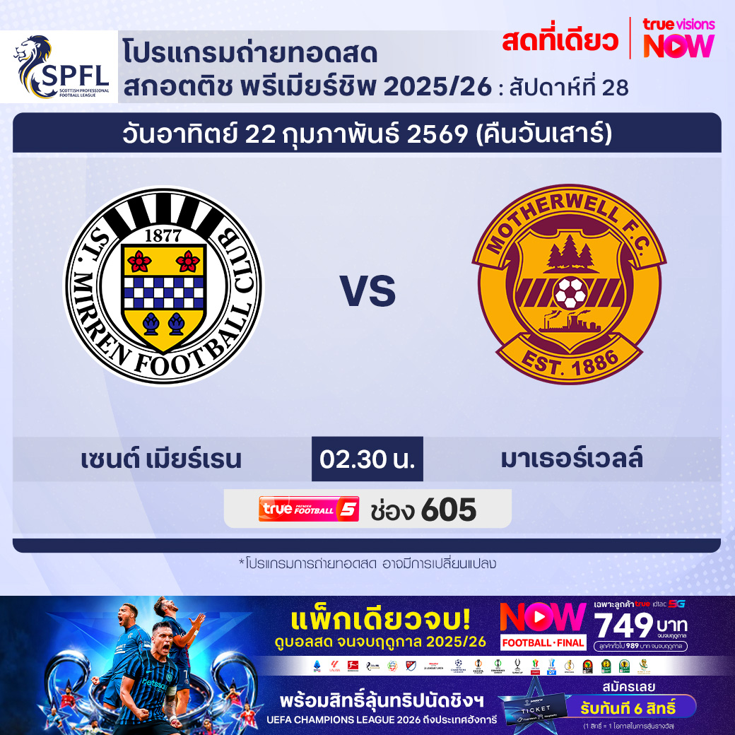 St. Mirren vs Motherwell เวลา 02.30-04.30 ทางช่องTPF 5(605)