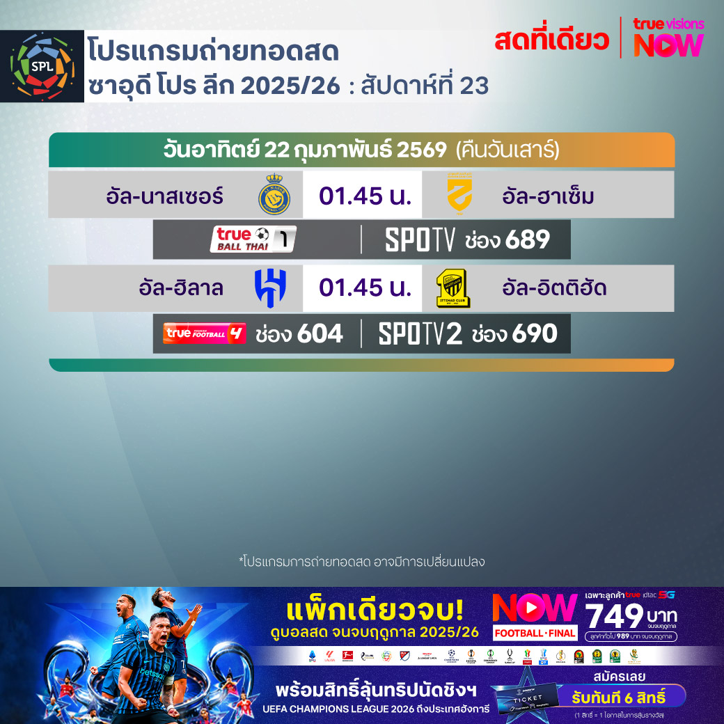 Al Nassr vs Al Hazem เวลา 01.45-04.00 ทางช่อง True Ball Thai 1 /SPOTV (689)