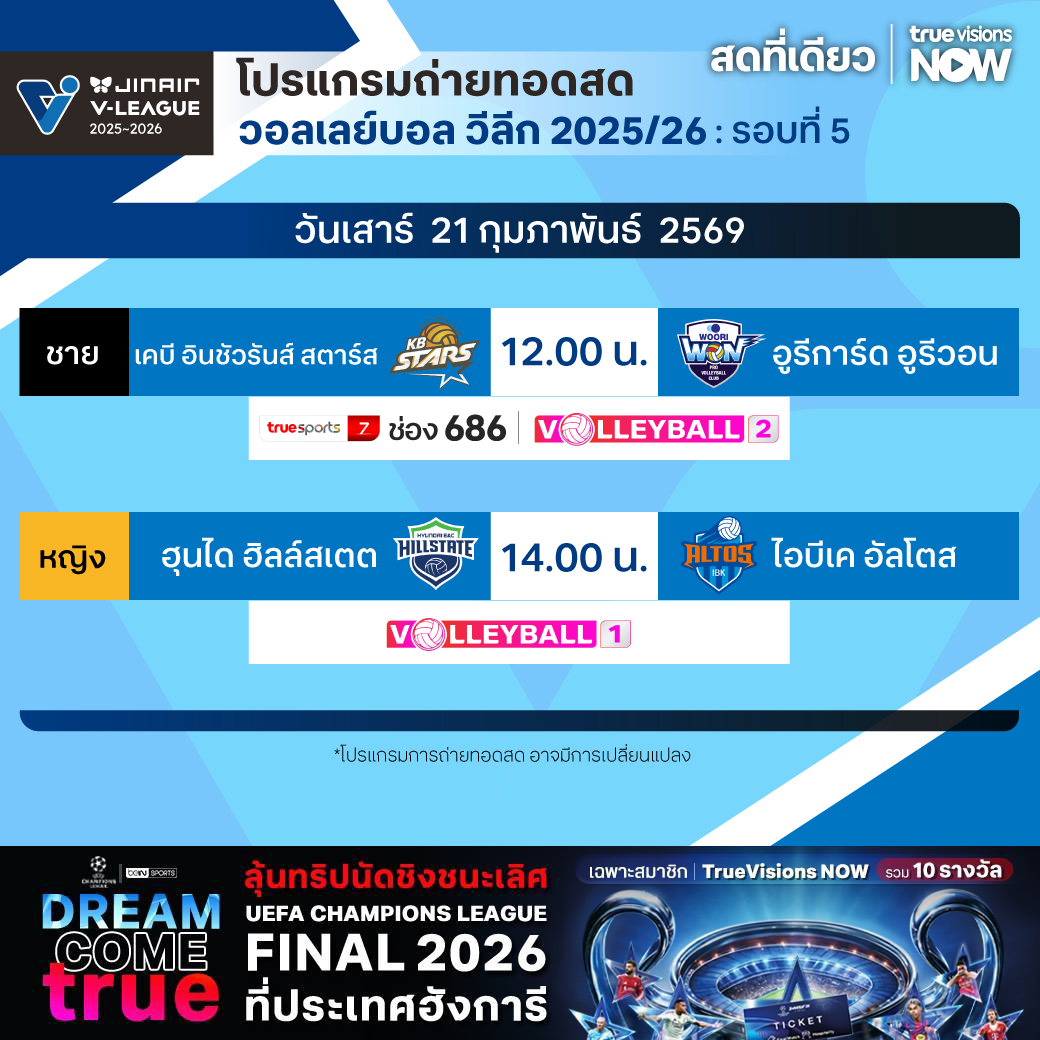 เคบี อินชัวรันส์ สตาร์ส พบ อูรีการ์ด อูรีวอน เวลา 12.00 ทางช่อง TS 7 (686) / Volleyball 2