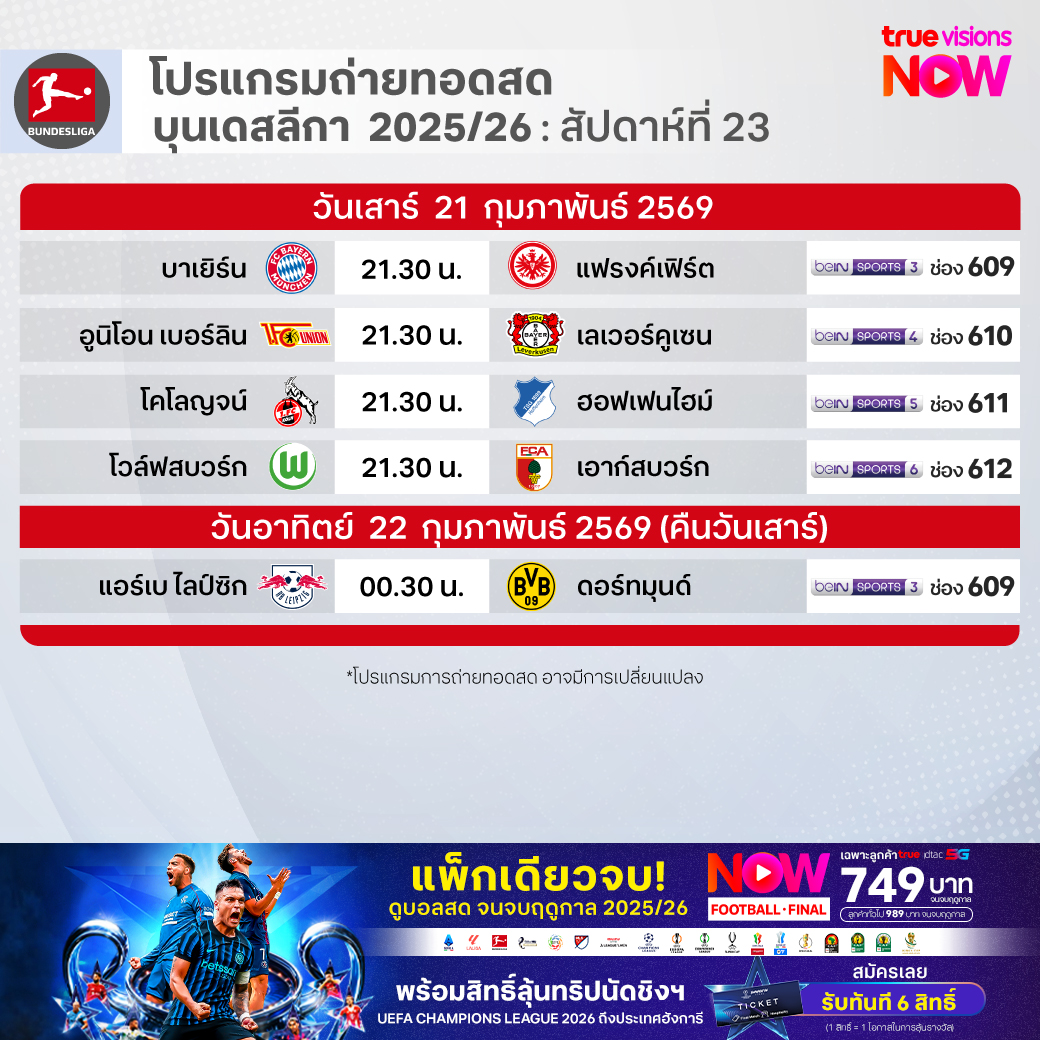 วันนี้มีอะไรดูที่ ทรูวิชั่นส์ ประจำวันเสาร์ที่ 21 กุมภาพันธ์ 69 ยังคงมีกีฬาที่น่าสนใจให้ได้ตามลุ้นตามเชียร์กันเหมือนเดิม โดยในส่วนของฟุตบอลยังมีศึก ลา ลีกา สเปน, บุนเดสลีกา เยอรมนี, กัลโช่ เซเรีย อา อิตาลี, สกอตติช พรีเมียร์ชิพ, ลีกา 2 เยอรมนี, เอ-ลีก ออสเตรเลีย และ ซาอุดิ โปร ลีก ให้ได้ตามเชียร์กันต่อ ส่วนกีฬาอื่นๆ ยังมีการแข่งขันโอลิมปิกฤดูหนาว 2026, ซูเปอร์ไบค์ เวิลด์ แชมเปี้ยนชิพ, เทนนิสหญิง ดับเบิ้ลยูทีเอ ทัวร์ รายการ ดูไบ แชมเปี้ยนชิพส์, เวิลด์ สนุกเกอร์ ทัวร์ รายการ เพลย์เยอร์ส แชมเปี้ยนชิพ, ยูเอฟซี ไฟต์ ไนท์, รักบี้ ซิกซ์ เนชั่นส์, มวยไทย ดิ อัลติเมท มวยไทย เอ็กซ์พีเรียนซ์, วอลเลย์บอล วี-ลีก และ วอลเลย์บอล ไทยแลนด์ ลีก งานนี้ ทรูวิชั่นส์ จัดเต็มให้ชมกันถึงบ้าน