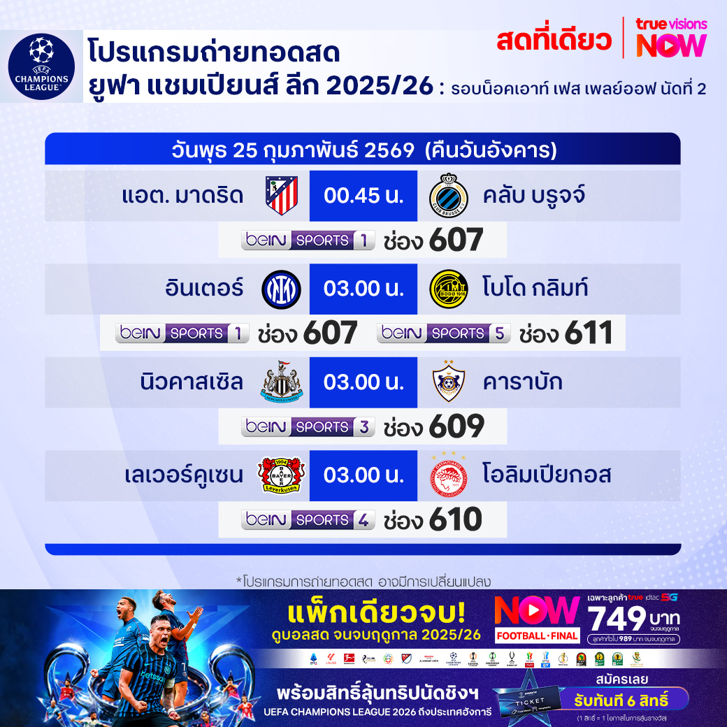 วันนี้มีอะไรดูที่ ทรูวิชั่นส์ ประจำวันอังคารที่ 24 กุมภาพันธ์ 69 ยังคงมีกีฬาที่น่าสนใจให้ได้ตามลุ้นตามเชียร์กันเหมือนเดิม โดยในส่วนของฟุตบอลยังมีศึก ยูฟ่า แชมเปี้ยนส์ ลีก รอบ น็อคเอาท์ เฟส เพลย์ออฟ นัดที่สอง ให้ได้ตามเชียร์กันต่อ ส่วนกีฬาอื่นๆ ยังมีการแข่งขันเทนนิสหญิง ดับเบิ้่ลยูทีเอ ทัวร์ รายการ เมริด้า โอเพ่น, กอล์ฟ ทูมอร์โรว์ กอล์ฟ ลีก, เวิลด์ สนุกเกอร์ ทัวร์ รายการ เวลช์ โอเพ่น, ฟุตซอลหญิงชิงแชมป์อาเซียน 2026, มวยไทย ดิ อัลติเมท มวยไทย เอ็กซ์พีเรียนซ์, วอลเลย์บอล ซีอีวี แชมเปี้ยนส์ ลีก และ วอลเลย์บอล วี-ลีก งานนี้ ทรูวิชั่นส์ จัดเต็มให้ชมกันถึงบ้าน