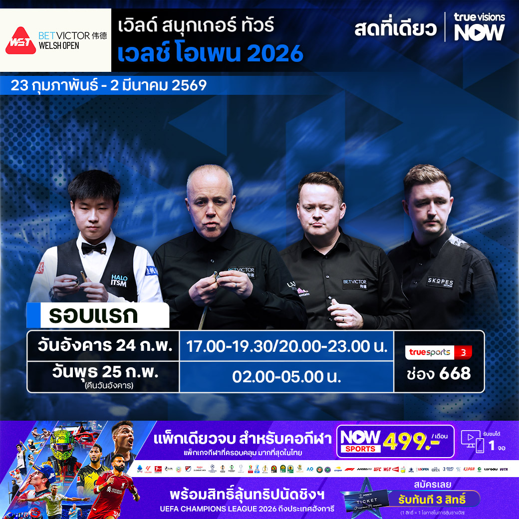 โค้งสุดท้ายของฤดูกาล สำหรับ เวิลด์ สนุกเกอร์ ทัวร์ เก็บคะแนนสะสมโลก ที่ต้องลุ้นกันสุดๆ สัปดาห์นี้ แฟนๆ จะได้ติดตามเกมระดับโลกของเหล่าบรรดาสุดยอดฝีมือของวงการมา ในรายการ เวลช์ โอเพ่น รายการเก่าแก่และยิ่งใหญ่ และเป็นซีรี่ส์ปิดท้ายของ โฮม เนชั่นส์ ซีรี่ส์ ที่แลนดัดโน่ แคว้นเวลส์ ใครจะไปถึงตำแหน่งแชมป์และครอบครอง เรย์ เรียร์ดอน โทรฟี่ อันทรงเกียรติ ชมสด ครบทุกรอบที่ ทรูวิชั่นส์