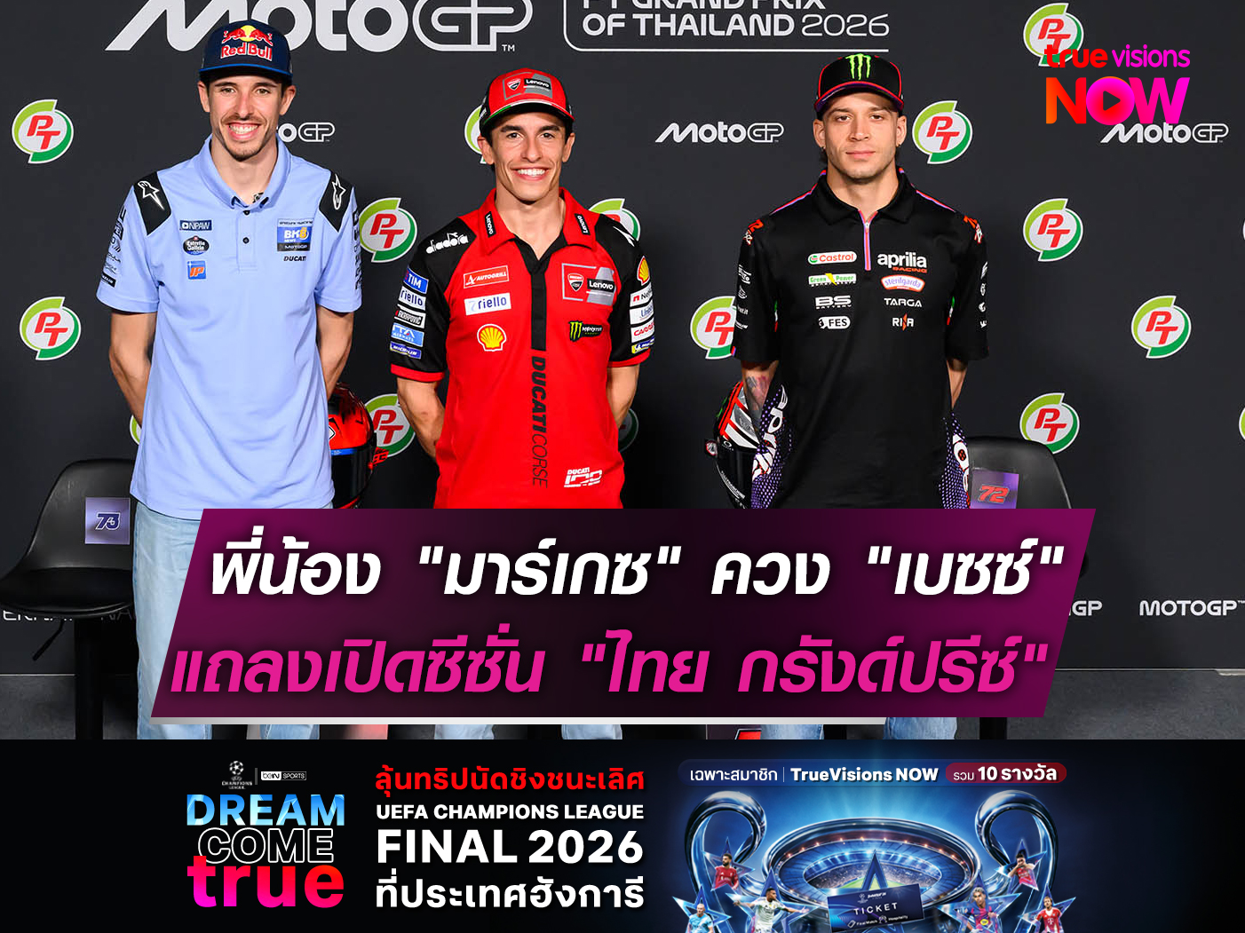 มาร์ค มาร์เกซ ยอดนักบิดแชมป์โลก 7 สมัย ควงคู่ อเล็กซ์ มาร์เกซ รองแชมป์โลกเมื่อฤดูกาลก่อน และ มาร์โก เบซเซคคี่ แถลงข่าวอย่างเป็นทางการ เปิดฉากมอเตอร์สปอร์ตสองล้อระดับโลก “โมโตจีพี 2026” ที่เข้าสู่โปรแกรม “พรีเรซ” ที่ สนามช้าง อินเตอร์เนชั่นแนล เซอร์กิต จ.บุรีรัมย์ พร้อมการถ่ายภาพประวัติศาสตร์บันทึกทำเนียบนักบิดทุกรุ่น ก่อนดวลเดือดในรายการ “พีที กรังด์ปรีซ์ ออฟ ไทยแลนด์” สุดสัปดาห์นี้