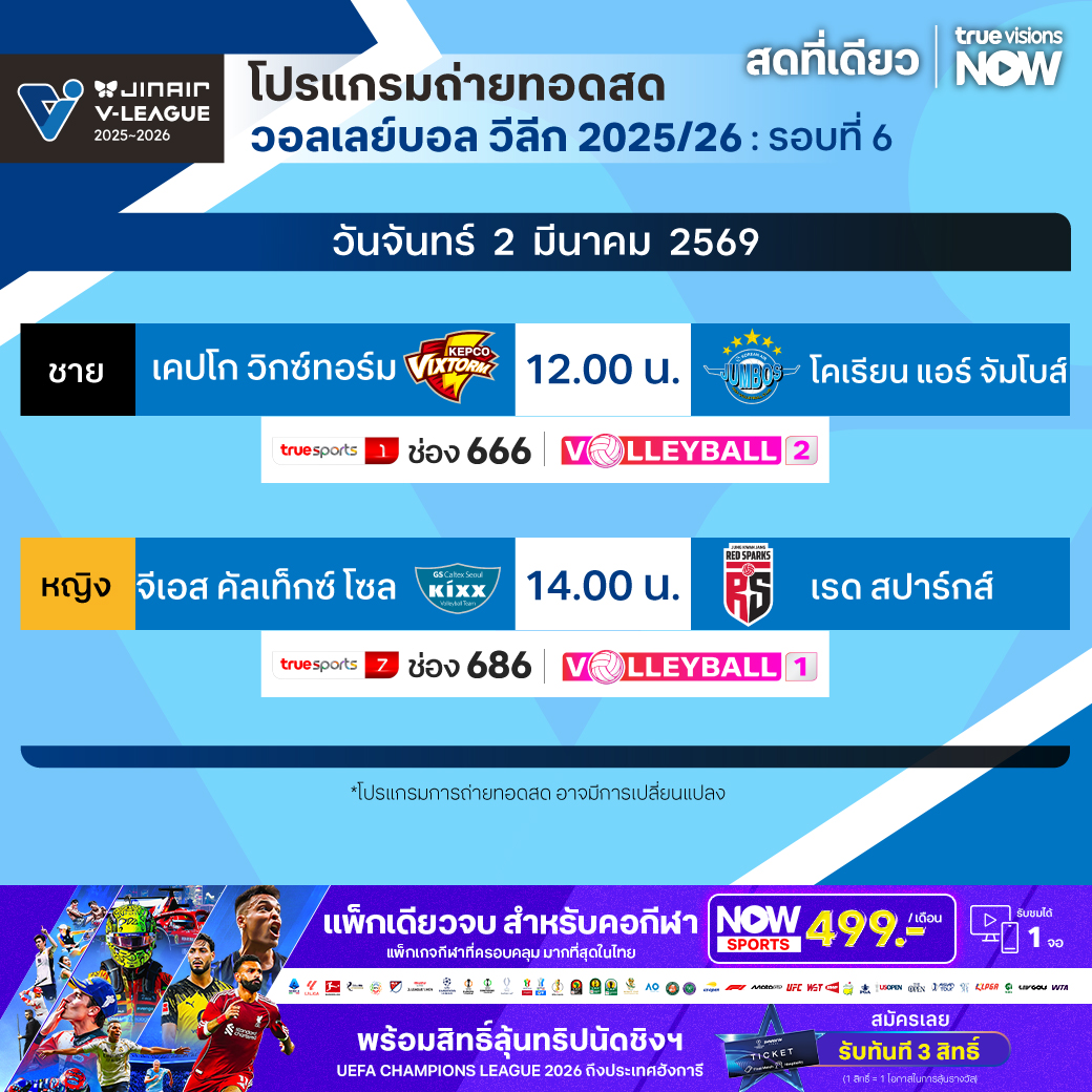 เคปโก วิกซ์ทอร์ม พบ โคเรียน แอร์ จัมโบส์ เวลา 12.00 ทางช่อง TS 1 (666) / Volleyball 2