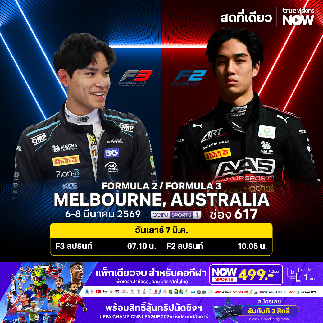มันส์และสนุกเร้าใจ กับการแข่งขันรถ ฟอร์มูล่า 2 / 3 แชมเปี้ยนชิพ ประเดิมเปิดฤดูกาล 2026 กับเรซแรก ที่ เมลเบิร์น พาร์ค ประเทศออสเตรเลีย ส่งใจเชียร์ 2 นักแข่งดาวรุ่งพุ่งแรงอนาคตไกลของไทย ใส่เต็มสปีด ช่วงชิงอันดับกับคู่แข่งระดับพระกาฬ ชมสด ครบทุกช่วงสำคัญของการแข่งขัน ที่ ทรูวิชั่นส์