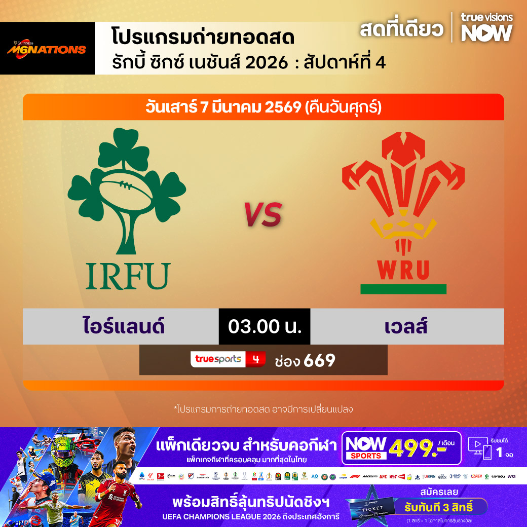 ไอร์แลนด์ พบ เวลส์ เวลา 03.00 ทางช่อง TS 4 (669)
