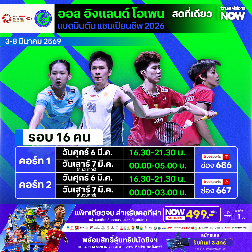 แบดมินตันรายการสำคัญที่แฟนๆ เฝ้ารอคอยติดตามชม กับศึก ออล อิงแลนด์ โอเพ่น แบดมินตัน แชมเปี้ยนชิพ ทัวร์นาเมนต์ระดับ เวิลด์ ทัวร์ ซูเปอร์ 1000 ที่มีประวัติศาสตร์เก่าแก่และสุดคลาสสิก ส่งใจเชียร์ทีมแบดมินตันไทย สู้สุดใจกับคู่แข่งระดับโลกจากทุกทวีป จากสนาม ยูทิลิต้า อารีน่า เมืองเบอร์มิงแฮม ประเทศอังกฤษ ชมสด เอ็กซ์คลูซีฟ ครบทุกรอบ ที่ ทรูวิชั่นส์