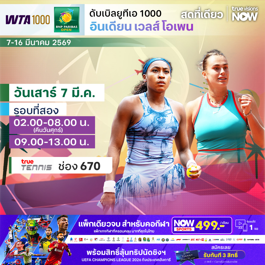 เทนนิสหญิง ดับเบิ้ลยูทีเอ ทัวร์ เข้าสู่เดือนมีนาคม เดือนที่มีรายการใหญ่แข่งติดต่อกัน 2 รายการ หรือที่เรียกว่าช่วง Sunshine Double สัปดาห์นี้พบกับรายการระดับ WTA 1000 อินเดียน เวลส์ โอเพ่น เทนนิสรายการใหญ่ที่มีคำนิยามว่าเป็น "แกรนด์สแลมที่ 5 ของปี" บรรดานักเทนนิสชื่อดังต่างตบเท้าเข้าร่วมการแข่งขันกันอย่างครบครัน นำโดย อารีนา ซาบาเลนก้า, โคโค กอฟ์ฟ, เอรินา ริบาคินา และ อิกา ซิออนเทค ร่วมลุ้นกันว่าใครจะคว้าแชมป์รายการที่ยิ่งใหญ่นี้ไปครอง ชมสด ครบทุกรอบ ที่ ทรูวิชั่นส์