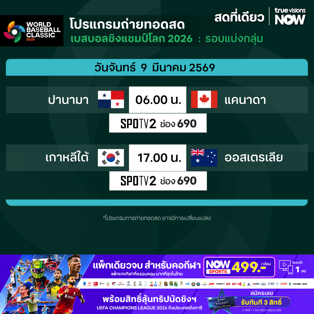 วันนี้มีอะไรดูที่ ทรูวิชั่นส์ ประจำวันจันทร์ที่ 9 มีนาคม 69 ยังคงมีกีฬาที่น่าสนใจให้ได้ตามลุ้นตามเชียร์กันเหมือนเดิม โดยในส่วนของฟุตบอลยังมีศึก ลา ลีกา สเปน และ กัลโช่ เซเรีย อา อิตาลี ให้ได้ตามเชียร์กันต่อ ส่วนกีฬาอื่นๆ ยังมี เทนนิสหญิง ดับเบิ้ลยูทีเอ ทัวร์ รายการ อินเดียน เวลส์ โอเพ่น, เบสบอลชิงแชมป์โลก และ มวยไทย ดิ อัลติเมท มวยไทย เอ็กซ์พีเรียนซ์ งานนี้ ทรูวิชั่นส์ จัดเต็มให้ชมกันถึงบ้าน