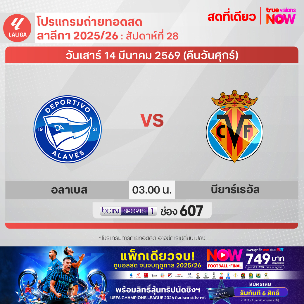 Alaves vs Villarreal เวลา 03.00-05.00 ทางช่อง beIN 1 (607)