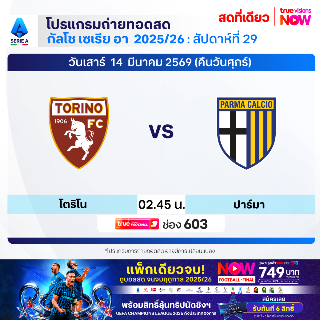 Torino vs Parma เวลา 02.45-04.45 ทางช่องTPF 3(603)