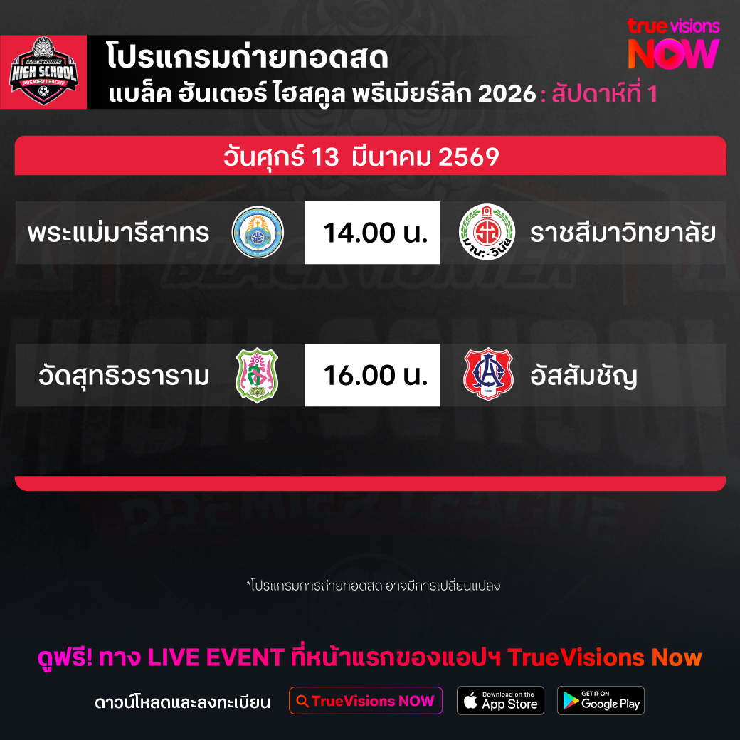 วันนี้มีอะไรดูที่ ทรูวิชั่นส์ ประจำวันศุกร์ที่ 13 มีนาคม 69 ยังคงมีกีฬาที่น่าสนใจให้ได้ตามลุ้นตามเชียร์กันเหมือนเดิม โดยในส่วนของฟุตบอลยังมีศึก ลา ลีกา สเปน, บุนเดสลีกา เยอรมนี, กัลโช่ เซเรีย อา อิตาลี, ลีกา 2 เยอรมนี, เอ-ลีก ออสเตรเลีย, ซาอุดิ โปร ลีก และ ฟุตบอลนักเรียนรายการ แบล็ค ฮันเตอร์ ไฮสคูล พรีเมียร์ลีก ให้ได้ตามเชียร์กันต่อ ส่วนกีฬาอื่นๆ คอมอเตอร์สปอร์ตพลาดไม่ได้กับศึก ฟอร์มูล่า วัน 2026 รายการ ไชนีส กรังด์ปรีซ์ นอกจากนี้ยังมี เทนนิสหญิง ดับเบิ้ลยูทีเอ ทัวร์ รายการ อินเดียน เวลส์ โอเพ่น, ลิฟ กอล์ฟ สิงคโปร์, กอล์ฟหญิง เลดี้ส์ ยูโรเปี้ยน ทัวร์ รายการ วีเมนส์ ออสเตรเลียน โอเพ่น, เคแอลพีจีเอ รายการ รีจูรัน แชมเปี้ยนชิพ, มวยไทย ดิ อัลติเมท มวยไทย เอ็กซ์พีเรียนซ์ และ วอลเลย์บอล วี-ลีก งานนี้ ทรูวิชั่นส์ จัดเต็มให้ชมกันถึงบ้าน