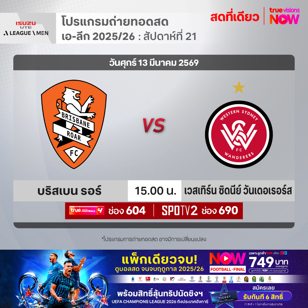 Brisbane Roar FC vs Western Sydney Wanderers FC เวลา 15.00-17.00 ทางช่องTPF 4(604) SPOTV2 (690)