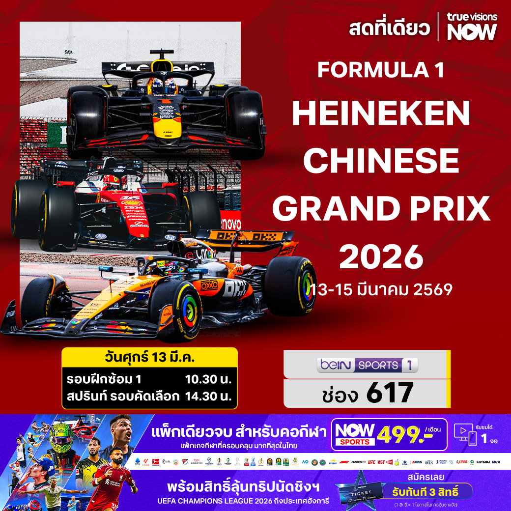 ศึก ฟอร์มูล่า วัน ฤดูกาล 2026 สัปดาห์นี้ ติดตามกันต่อกับความสนุกตื่นเต้นจากเรซที่ 2 รายการ ไชนีส กรังด์ปรีซ์ ที่สนามเซี่ยงไฮ้ อินเตอร์เนขั่นแนล เซอร์กิต นครเซี่ยงไฮ้ ประเทศจีน จับตาดูทีมหัวแถวระดับเต็งแชมป์ แม็คลาเรน, เฟอร์รารี่, เมอร์เซเดส รวมไปถึง เร้ดบูลล์ ทีมใดจะทำได้ดีกว่ากัน ชมสด ครบทุกช่วงการแข่งขัน ที่ ทรูวิชั่นส์