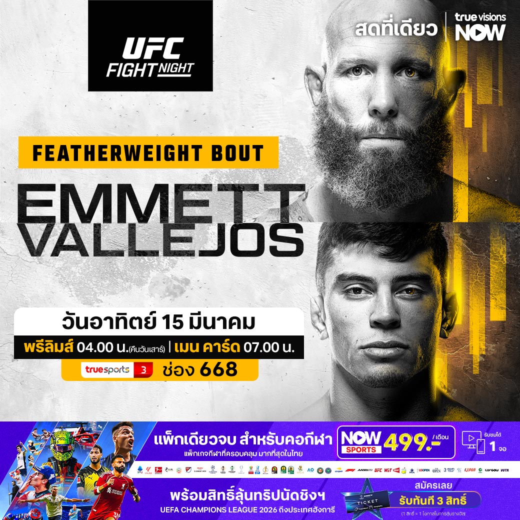 ยูเอฟซี ไฟต์ ไนท์ สัปดาห์นี้ ปักหลักดวลกันที่ เมต้า เอเพ็กซ์ ในลาสเวกัส รัฐเนวาด้า ประเทศสหรัฐอเมริกา คู่เอก รุ่นเฟเธอร์เวต จอช เอ็มเม็ตต์ นักสู้พันธุ์ดุชาวอเมริกัน พร้อมเปิดหน้าแลกกับคู่ต่อสู้จอมแกร่งจากอาร์เจนติน่า เควิน บาเยโฆส ร่วมด้วยรุ่นสตรอว์เวตหญิง อะแมนด้า เลโมส รองแชมป์อันดับ 5 จากบราซิล ปะทะนักสู้จากแคนาดา กิลเลียน โรเบิร์ตสัน ชมสด ทั้งรอบพรีลิมส์ และ เมน คาร์ด ที่ ทรูวิชั่นส์