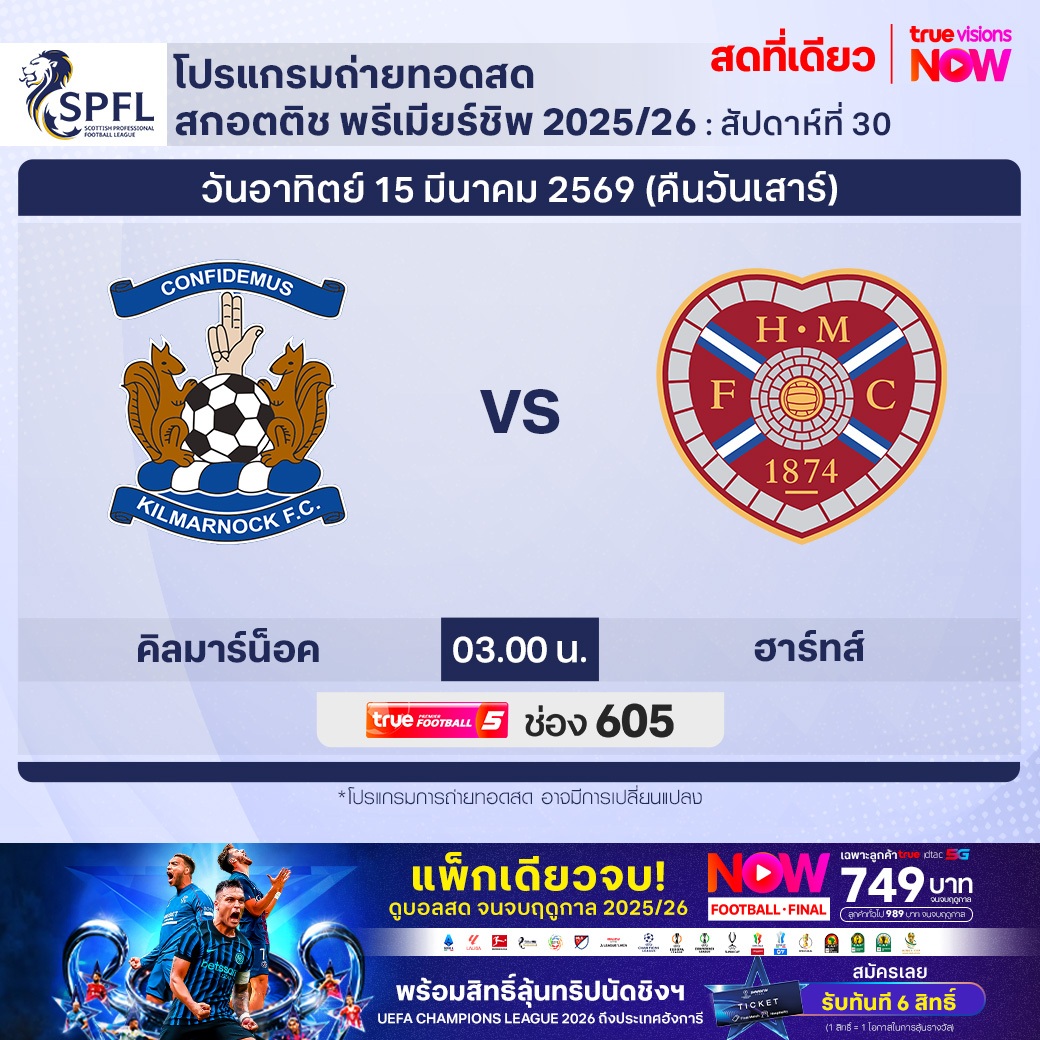 Kilmarnock vs Heart of Midlothian เวลา 03.00-05.00 ทางช่องTPF 5(605)