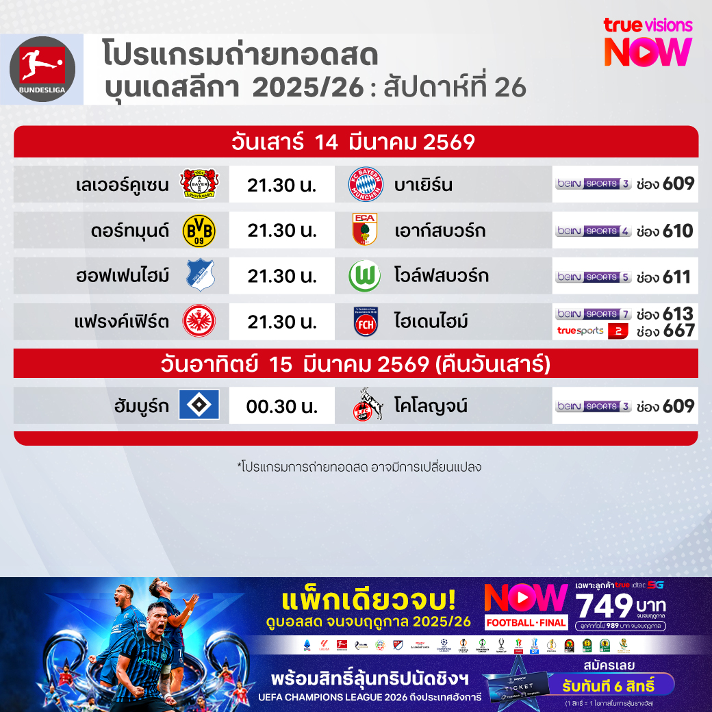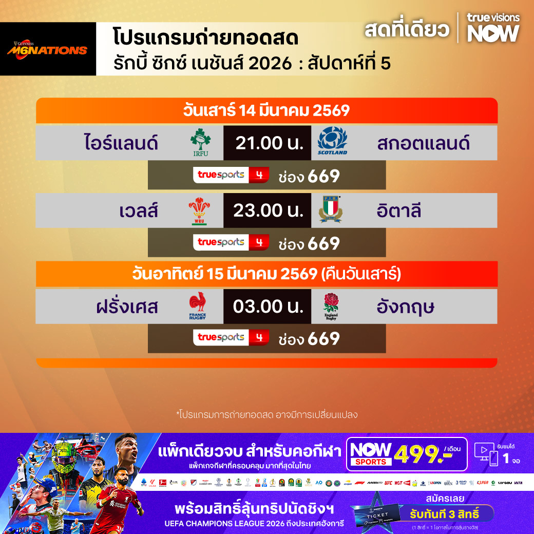 วันนี้มีอะไรดูที่ ทรูวิชั่นส์ ประจำวันเสาร์ที่ 14 มีนาคม 69 ยังคงมีกีฬาที่น่าสนใจให้ได้ตามลุ้นตามเชียร์กันเหมือนเดิม โดยในส่วนของฟุตบอลยังมีศึก ลา ลีกา สเปน, บุนเดสลีกา เยอรมนี, กัลโช่ เซเรีย อา อิตาลี, สกอตติช พรีเมียร์ชิพ และ ซาอุดิ โปร ลีก ให้ได้ตามเชียร์กันต่อ ส่วนกีฬาอื่นๆ คอมอเตอร์สปอร์ตพลาดไม่ได้กับศึก ฟอร์มูล่า วัน 2026 รายการ ไชนีส กรังด์ปรีซ์ นอกจากนี้ยังมี ลิฟ กอล์ฟ สิงคโปร์, กอล์ฟหญิง เลดี้ส์ ยูโรเปี้ยน ทัวร์ รายการ วีเมนส์ ออสเตรเลียน โอเพ่น, เคแอลพีจีเอ รายการ รีจูรัน แชมเปี้ยนชิพ, แบดมินตัน บีดับเบิ้ลยูเอฟ รายการ สวิส โอเพ่น, ยูเอฟซี ไฟต์ ไนท์, รักบี้ ซิกซ์ เนชั่นส์, มวยไทย ดิ อัลติเมท มวยไทย เอ็กซ์พีเรียนซ์, วอลเลย์บอล วี-ลีก และ วอลเลย์บอล ไทยแลนด์ ลีก งานนี้ ทรูวิชั่นส์ จัดเต็มให้ชมกันถึงบ้าน