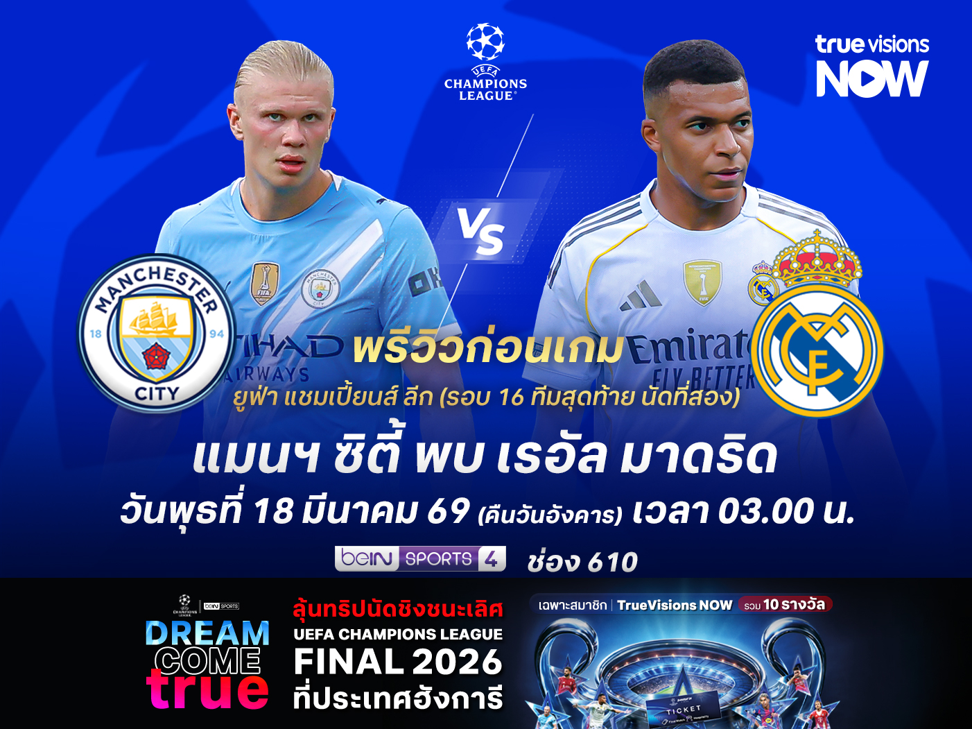 ศึก ยูฟ่า แชมเปี้ยนส์ ลีก 2025-26 รอบ 16 ทีมสุดท้าย นัดที่สอง แมนเชสเตอร์ ซิตี้ จากอังกฤษ จะเล่นที่ เอติฮัด สเตเดี้ยม รับการมาเยือนของ เรอัล มาดริด จากสเปน โดยเกมนี้ แมนฯ ซิตี้ เจ้าถิ่น แพ้ในเกมแรกมาอย่างขาดลอยถึง 3-0 ทำให้เกมนี้ไม่มีทางเลือก ต้องเปิดเกมรุกเพื่อยิงประตูให้เร็วที่สุด ขณะที่ เรอัล มาดริด ไม่จำเป็นต้องเปิดเกมแลก แต่น่าจะเน้นเหนียวแน่นและรอเล่นเกมโต้กลับมากกว่า นั่นทำให้เกมนี้ แมนฯ ซิตี้ อาจจะเบียดชนะได้ แต่ไม่น่าพอต่อการเข้ารอบ