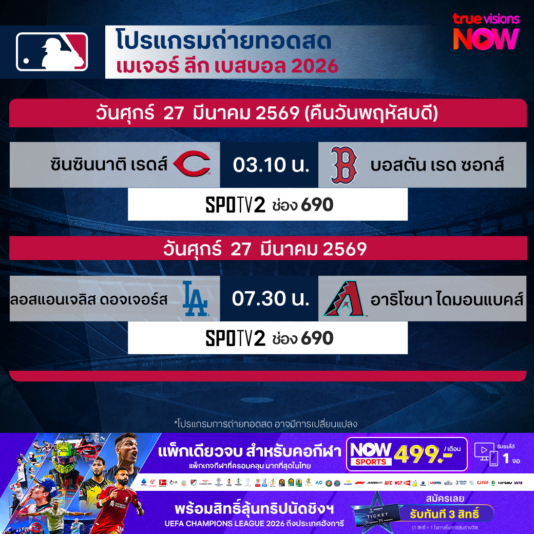 ซินซินนาติ เรดส์ พบ บอสตัน เรด ซอกส์ เวลา 03.10 ทางช่อง SPOTV2 (690)