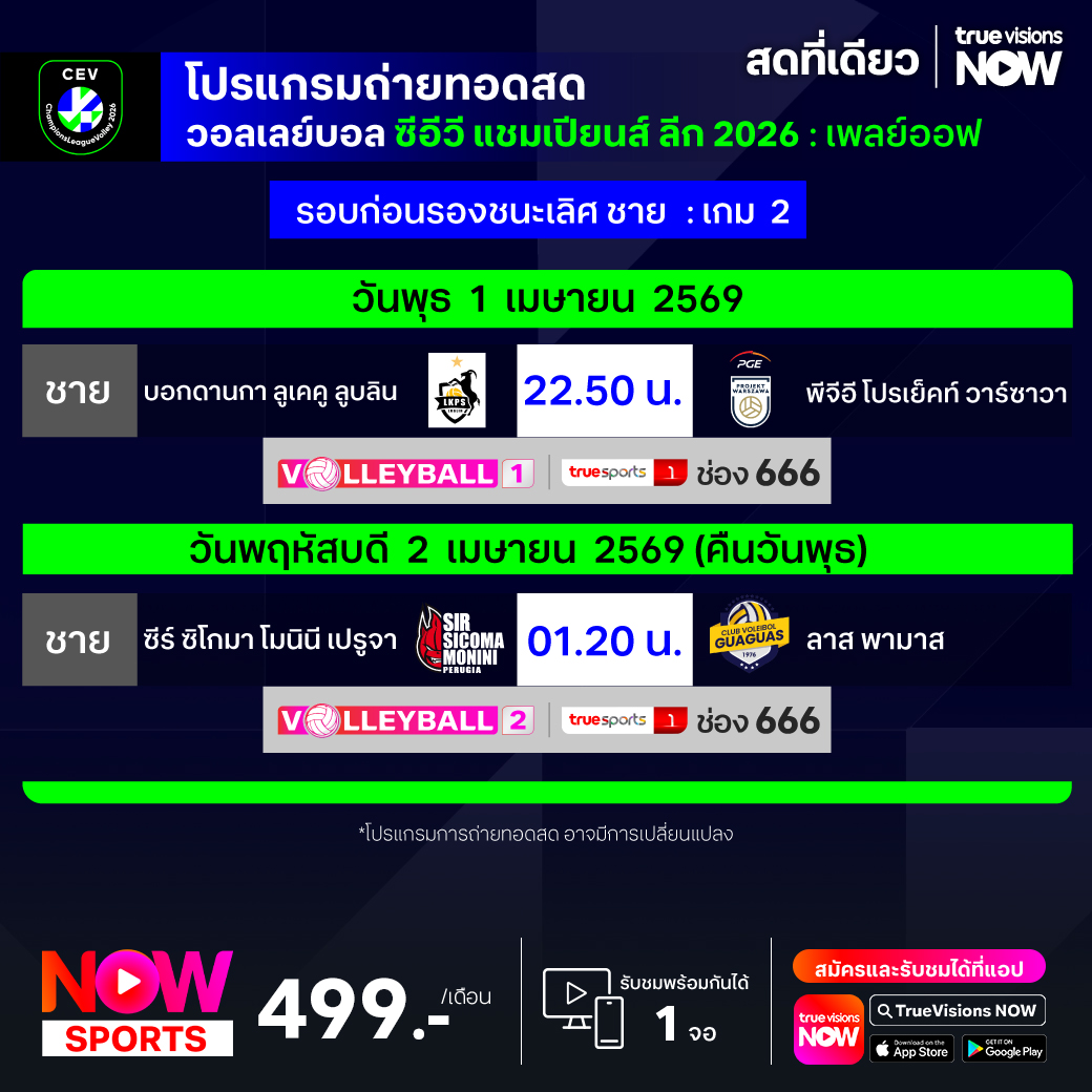 ซีร์ ซิโกมา โมนินี เปรูจา พบ ลาส พามาส เวลา 01.20 ทางช่อง Volleyball 2/TS 1 (666)