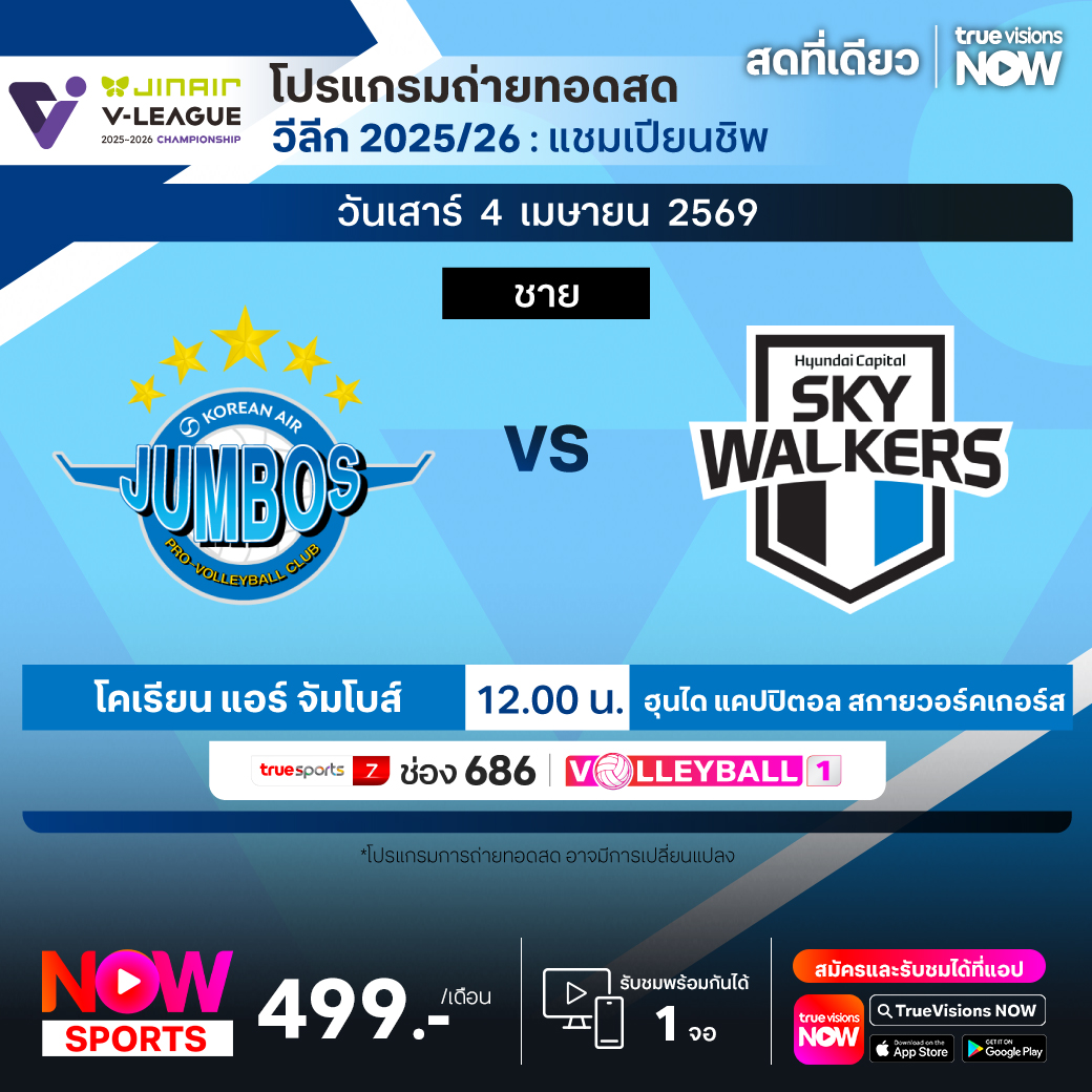 โคเรียน แอร์ จัมโบส์ พบ ฮุนได แคปปิตอล สกายวอร์คเกอร์ส เวลา 12.00 ทางช่อง TS 7 (686) / Volleyball 1
