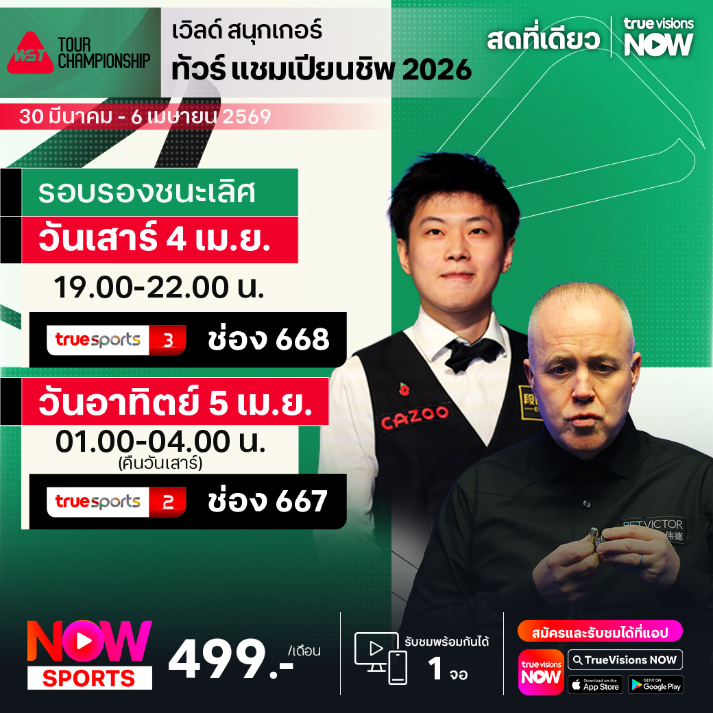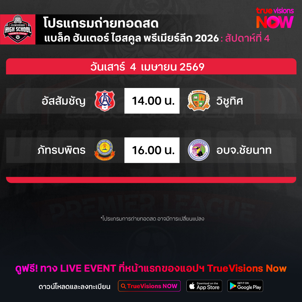 วันนี้มีอะไรดูที่ ทรูวิชั่นส์ ประจำวันเสาร์ที่ 4 เมษายน 69 ยังคงมีกีฬาที่น่าสนใจให้ได้ตามลุ้นตามเชียร์กันเหมือนเดิม โดยในส่วนของฟุตบอลยังมี ลา ลีกา สเปน, บุนเดสลีกา เยอรมนี, กัลโช่ เซเรีย อา อิตาลี, เอ-ลีก ออสเตรเลีย, ซาอุดิ โปร ลีก และ ฟุตบอลนักเรียน แบล็ก ฮันเตอร์ ไฮสคูล พรีเมียร์ลีก ให้ได้ตามเชียร์กันต่อ ส่วนกีฬาอื่นๆ ยังมี เทนนิสหญิง ดับเบิ้ลยูทีเอ ทัวร์ รายการ ชาร์ลสตัน โอเพ่น, กอล์ฟ เอเชียนทัวร์ รายการ อินเตอร์เนชั่นแนล ซีรี่ส์ แจแปน, เลดี้ส์ ยูโรเปี้ยน ทัวร์ รายการ อารัมโก้ แชมเปี้ยนชิพ, เคแอลพีจีเอ ทัวร์ รายการ เดอะ ซีน่า โอเพ่น, เวิลด์ สนุกเกอร์ ทัวร์ รายการ ทัวร์ แชมเปี้ยนชิพ, เมเจอร์ ลีก เบสบอล, พิคเคิลบอล ฮานอย คัพ, ยูเอฟซี ไฟต์ ไนท์, มวยไทย ดิ อัลติเมท มวยไทย เอ็กซ์พีเรียนซ์, วอลเลย์บอล วี-ลีก และ วอลเลย์บอล ไทยแลนด์ ลีก งานนี้ ทรูวิชั่นส์ จัดเต็มให้ชมกันถึงบ้าน