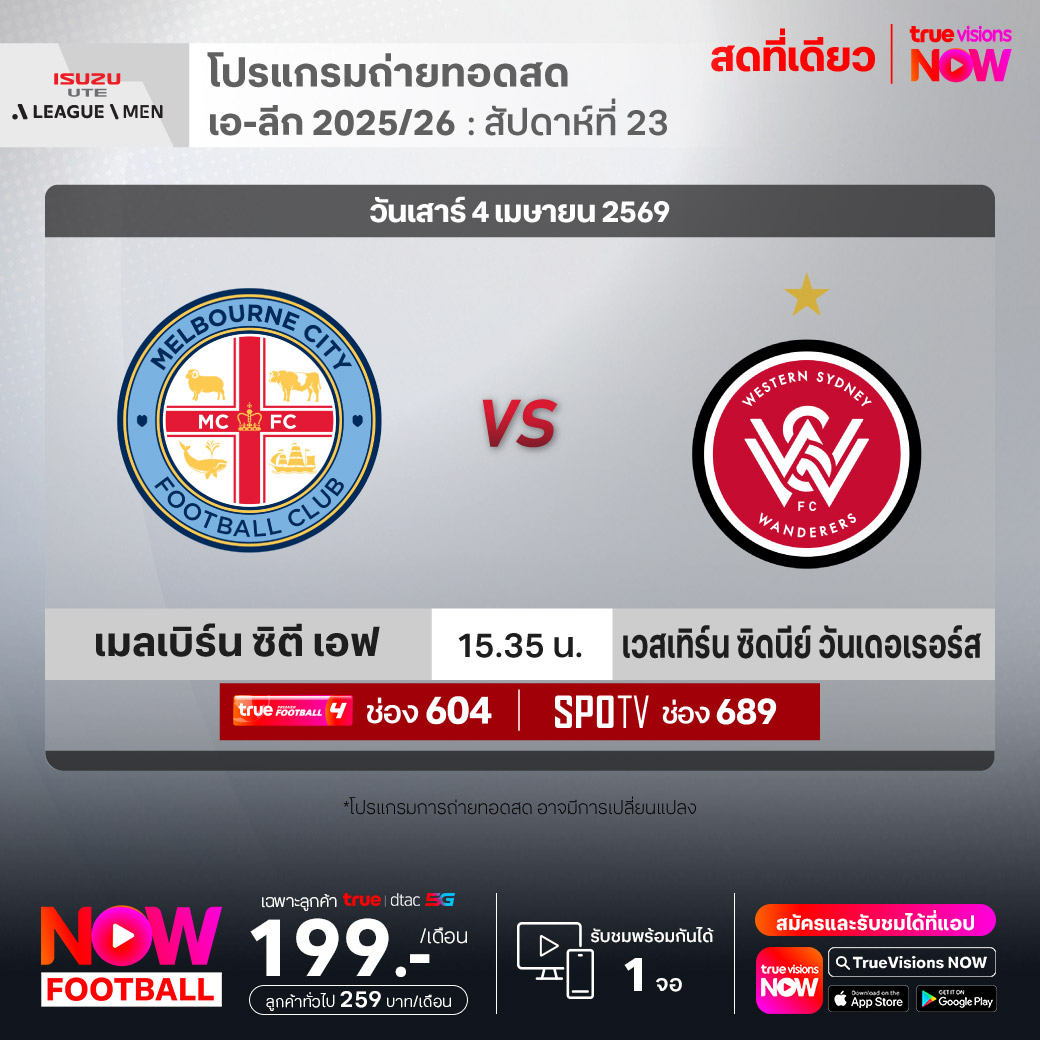 Melbourne City FC vs Western Sydney Wanderers FC เวลา 15.35-17.35 ทางช่องTPF 4(604) / SPOTV (689)