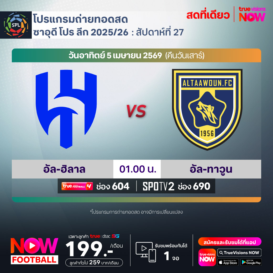 Al Hilal vs Al Taawoun เวลา 01.00-03.00 ทางช่องTPF 4(604) / SPOTV2 (690)