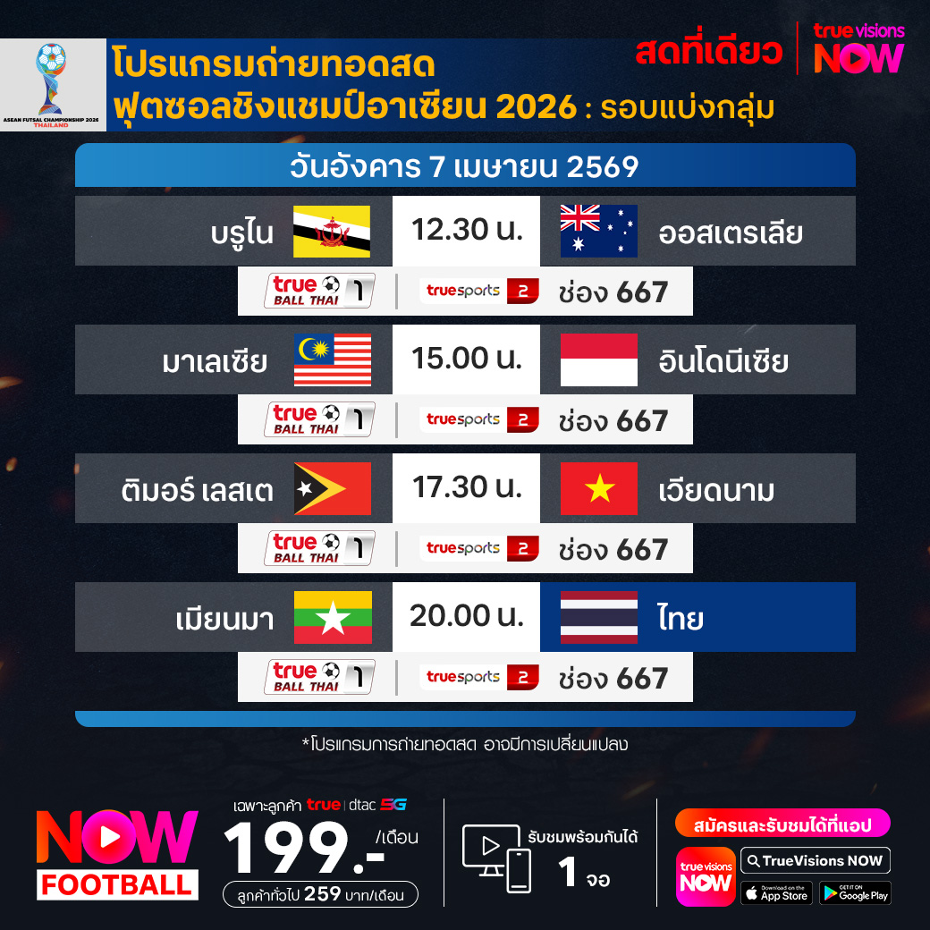 บรูไน พบ ออสเตรเลีย เวลา 12.30 ทางช่อง True Ball Thai 1/TS 2 (667)