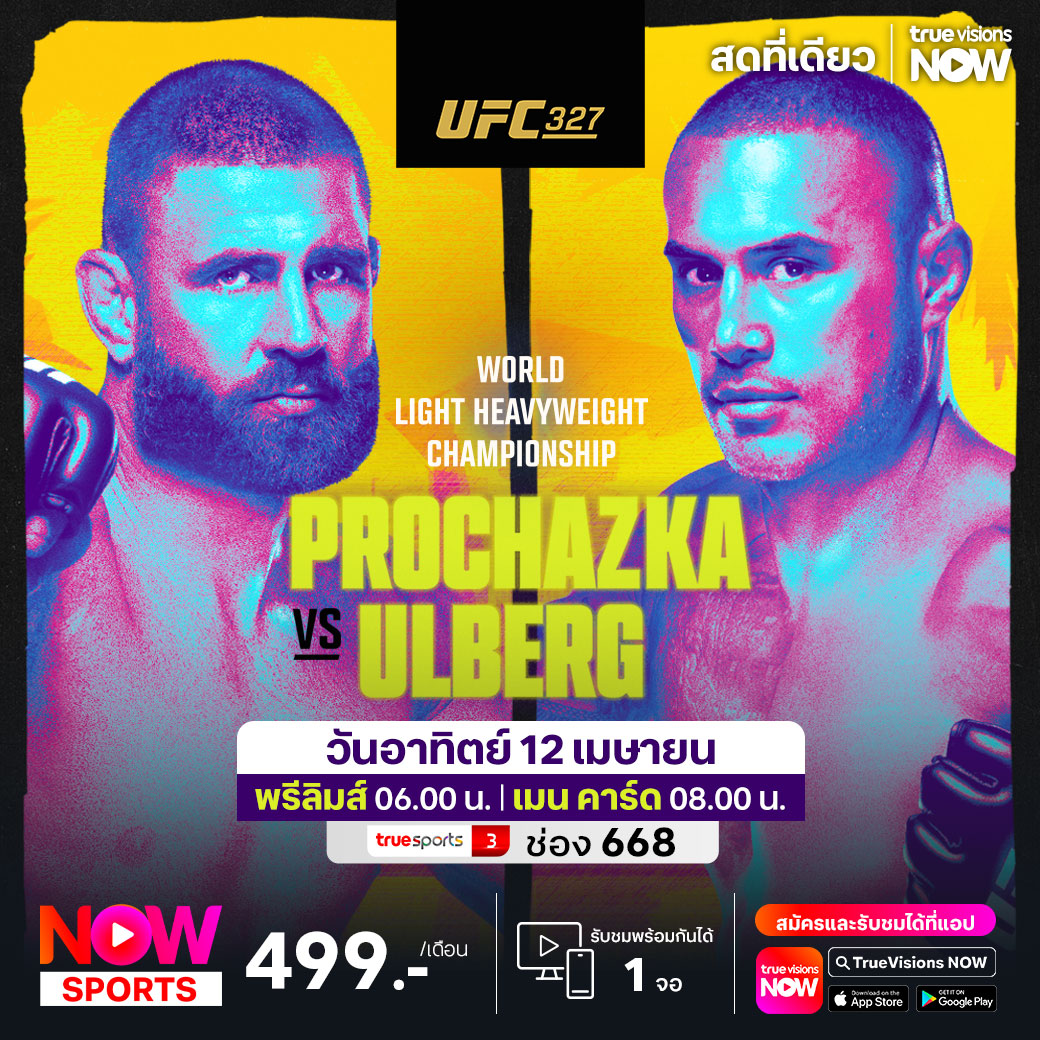 ยูเอฟซี 327 คู่เอกเป็นการชิงแชมป์รุ่นไลต์เฮฟวี่เวตที่ว่างลง ระหว่างรองแชมป์อันดับ 2 ยีรี่ โปรฮาสก้า นักสู้จากเช็ก ปะทะคู่ต่อสู้ที่ฟอร์มกำลังฮอตสุดๆ คาร์ลอส อูลเบิร์ก รองแชมป์อันดับ 3 จากนิวซีแลนด์ และคู่เอกร่วม ชิงแชมป์ฟลายเวต ระหว่าง โจชัว แวน เจ้าของตำแหน่งชาวเมียนมาร์ พบผู้ท้าชิงจากญี่ปุ่น ทัตซึโระ ทาอิระ ชมสด เอ็กซ์คลูซีฟ จากคาซียา เซนเตอร์ ไมอามี่ ประเทศสหรัฐอเมริกา ที่ ทรูวิชั่นส์