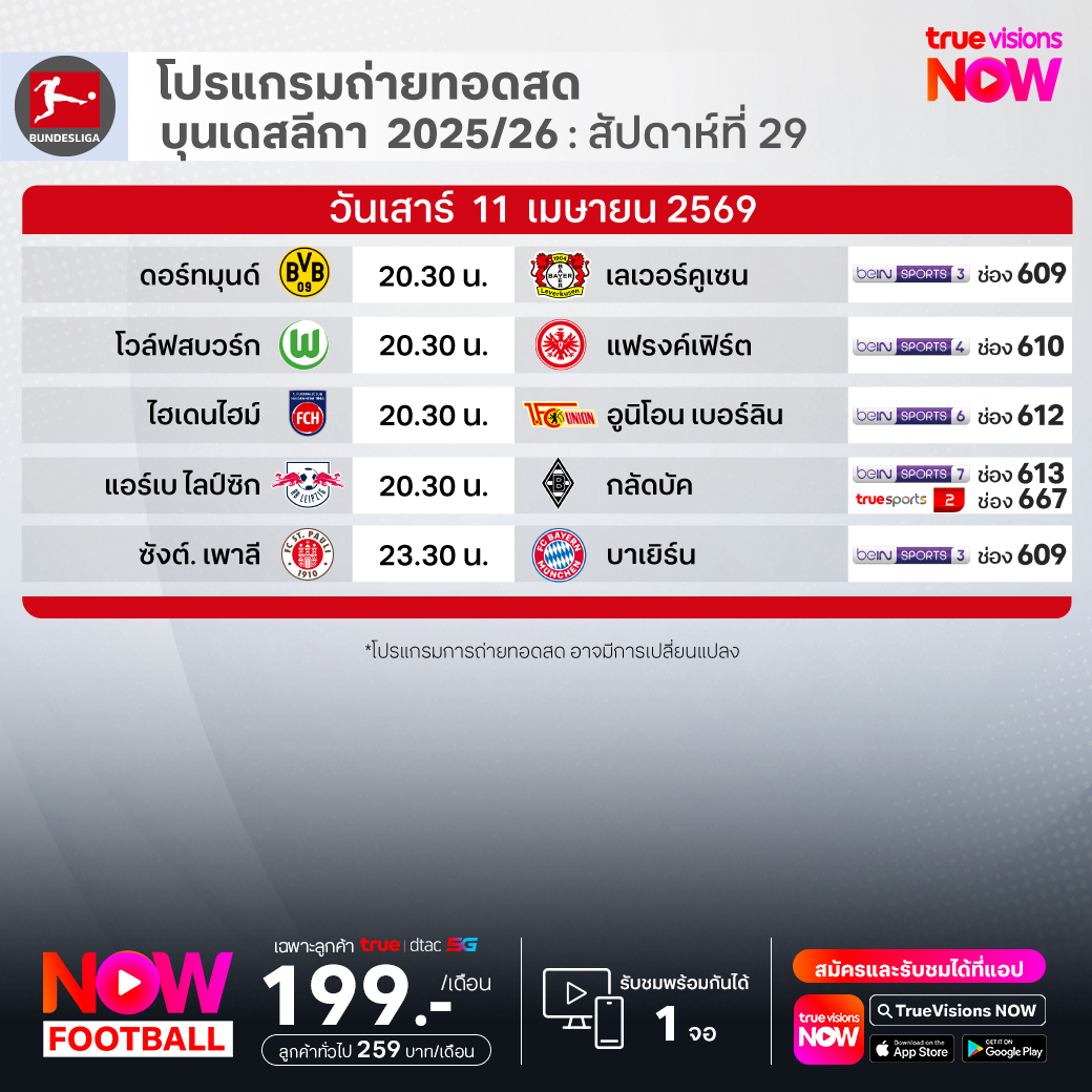 โบรุสเซีย ดอร์ทมุนด์ พบ ไบเออร์ เลเวอร์คูเซ่น เวลา 20.30-22.30 ทางช่อง beIN 3 (609)