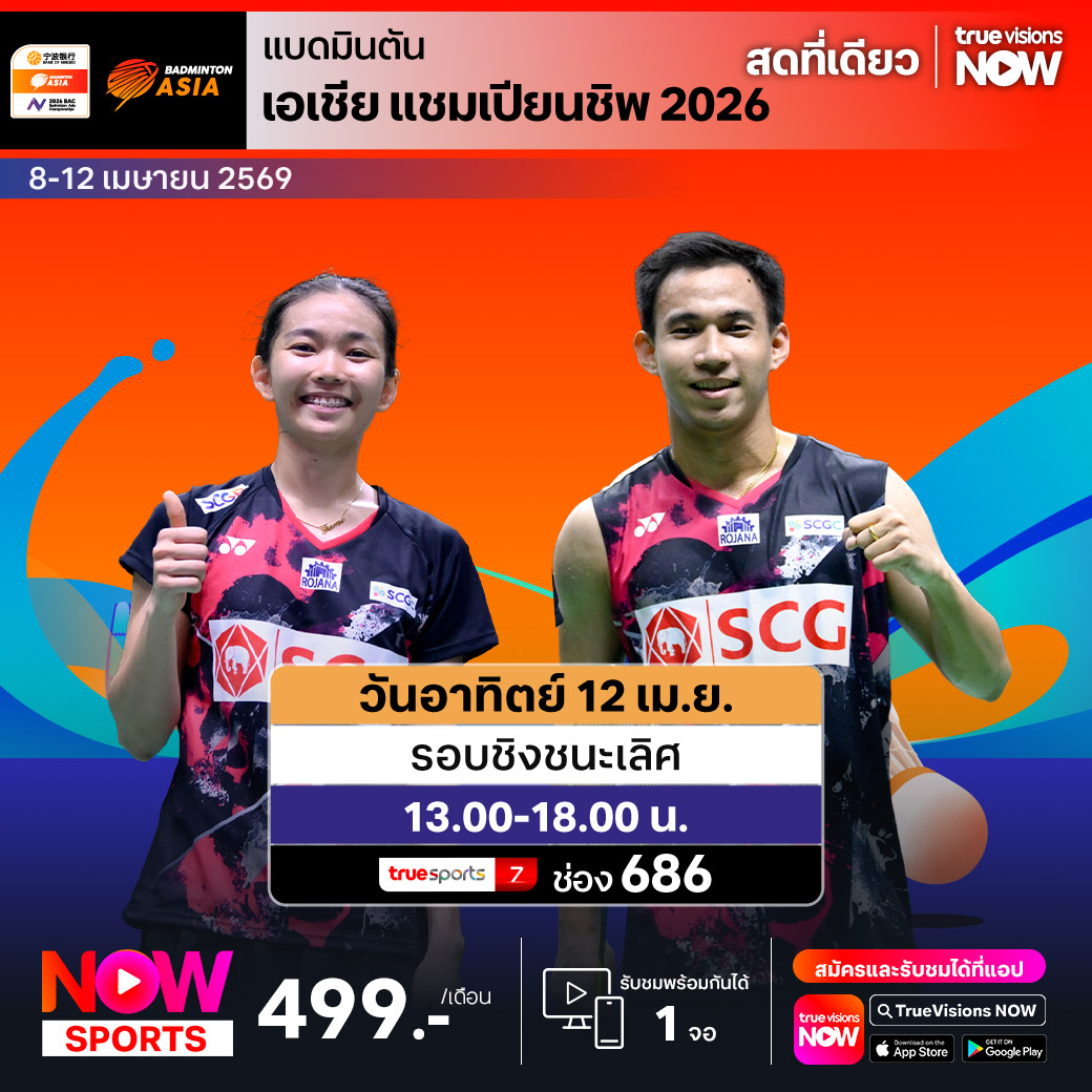 สัปดาห์นี้ แฟนๆ กีฬาแบดมินตัน พบกับรายการ แบดมินตัน เอเชีย แชมเปี้ยนชิพ 2026 จาก หนิงโป ประเทศจีน ส่งใจเชียร์นักแบดไทย "บาส" เดชาพล พัววรานุเคราะห์ กับ "เฟม" ศุภิสรา เพียวสามพราน คว้าแชมป์ในรายการนี้ให้ได้ ชมสด เชียร์มันส์จุใจ ที่ ทรูวิชั่นส์ ที่เดียว