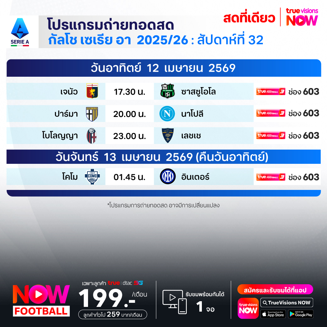 เจนัว พบ ซาสซูโอโล่ เวลา 17.30-19.30 ทางช่อง TPF 3 (603)