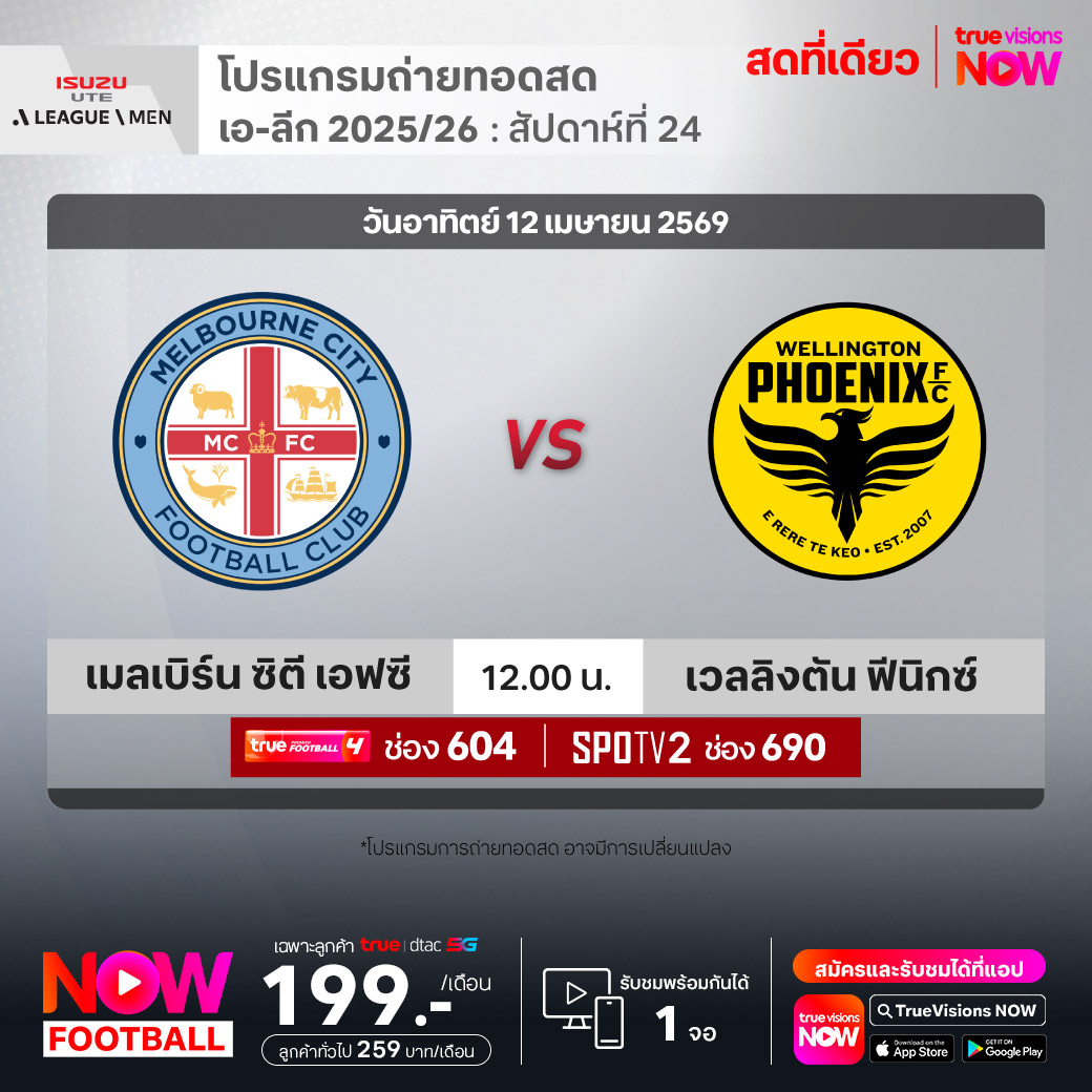 เมลเบิร์น ซิตี้ เอฟซี พบ เวลลิงตัน ฟีนิกซ์ เวลา 12.00-14.00 ทางช่อง TPF 4 (604) / SPOTV 2 (690)