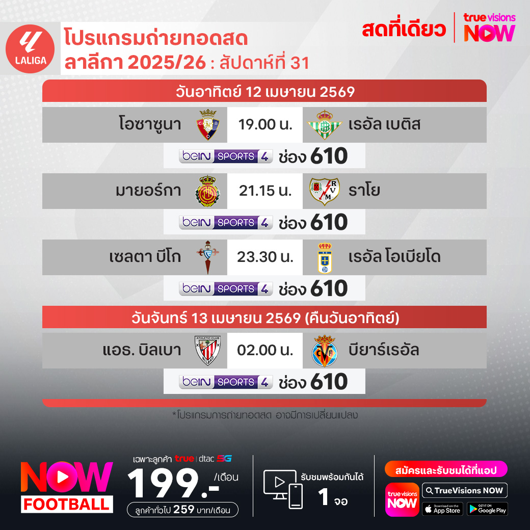 โอซาซูน่า พบ เรอัล เบติส เวลา 19.00-21.00 ทางช่อง beIN 4 (610)