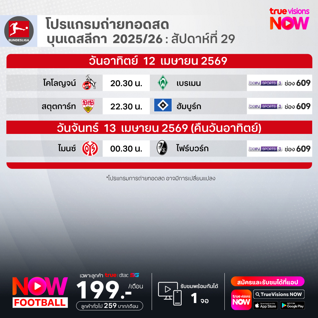 โคโลญจน์ พบ แวร์เดอร์ เบรเมน เวลา 20.30-22.30 ทางช่อง beIN 3 (609)