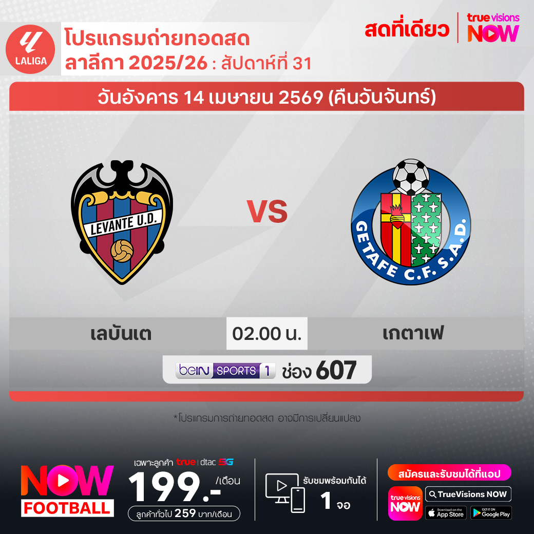 วันนี้มีอะไรดูที่ ทรูวิชั่นส์ ประจำวันจันทร์ที่ 13 เมษายน 69 ยังคงมีกีฬาที่น่าสนใจให้ได้ตามลุ้นตามเชียร์กันเหมือนเดิม โดยในส่วนของฟุตบอลยังมีศึก ลา ลีกา สเปน และ กัลโช่ เซเรีย อา อิตาลี ให้ได้ตามเชียร์กันต่อ ส่วนกีฬาอื่นๆ ยังมี เมเจอร์ ลีก เบสบอล และ มวยไทย ดิ อัลติเมท มวยไทย เอ็กซ์พีเรียนซ์ งานนี้ ทรูวิชั่นส์ จัดเต็มให้ชมกันถึงบ้าน