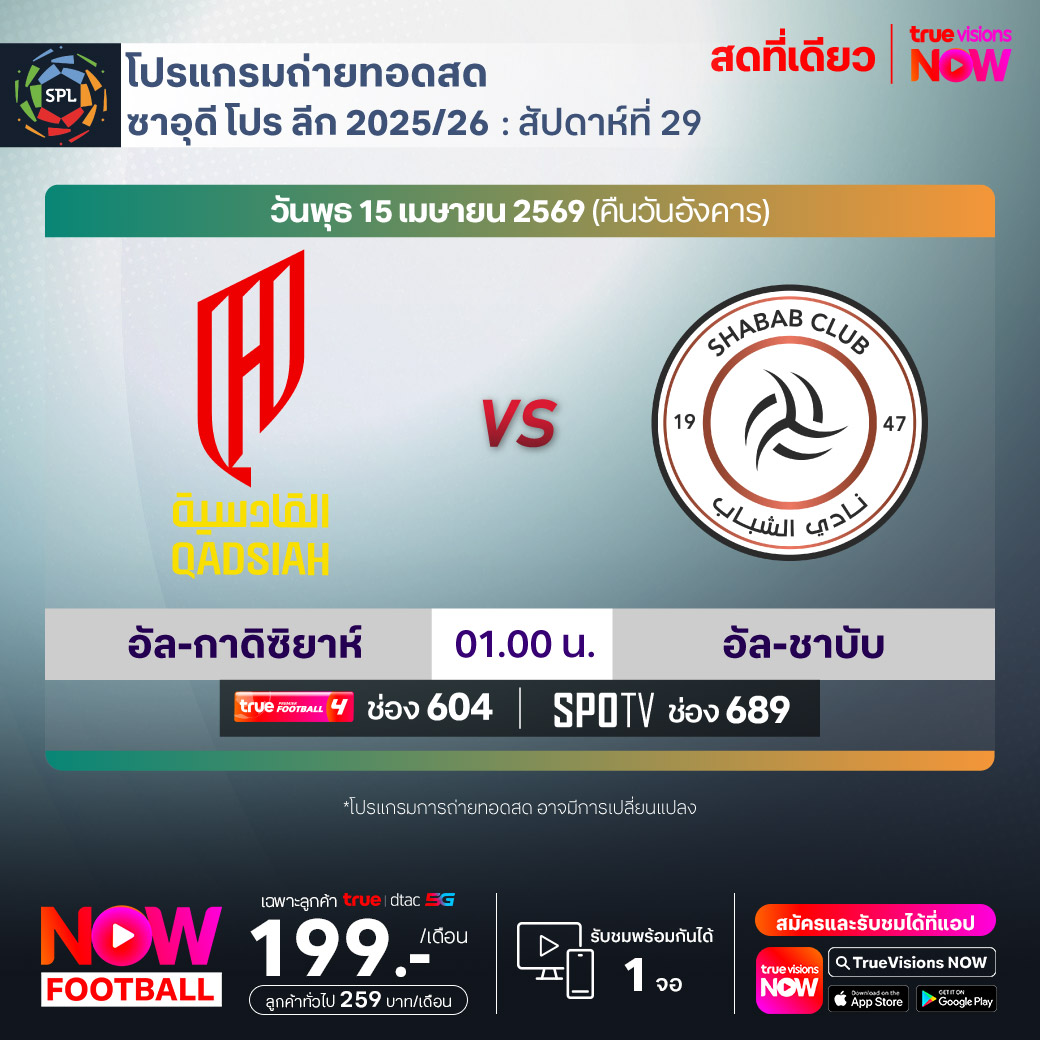 อัล-กาดิซิยาห์ พบ อัล-ชาบับ เวลา 01.00-03.00 ทางช่อง TPF 4 (604) / SPOTV (689)