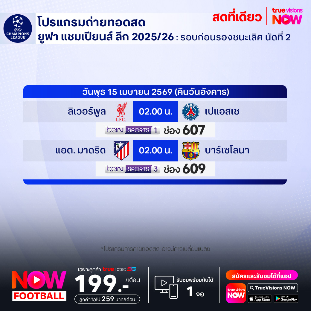 วันนี้มีอะไรดูที่ ทรูวิชั่นส์ ประจำวันอังคารที่ 14 เมษายน 69 ยังคงมีกีฬาที่น่าสนใจให้ได้ตามลุ้นตามเชียร์กันเหมือนเดิม โดยในส่วนของฟุตบอลยังมีศึก ยูฟ่า แชมเปี้ยนส์ ลีก รอบก่อนรองชนะเลิศ นัดที่สอง และ ซาอุดิ โปร ลีก ให้ได้ตามเชียร์กันต่อ ส่วนกีฬาอื่นๆ ยังมี เทนนิสหญิง ดับเบิ้ลยูทีเอ ทัวร์ รายการ ปอร์เช่ เทนนิส กรังด์ปรีซ์ และ มวยไทย ดิ อัลติเมท มวยไทย เอ็กซ์พีเรียนซ์ งานนี้ ทรูวิชั่นส์ จัดเต็มให้ชมกันถึงบ้าน
