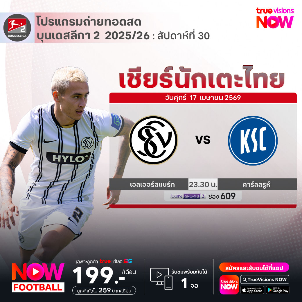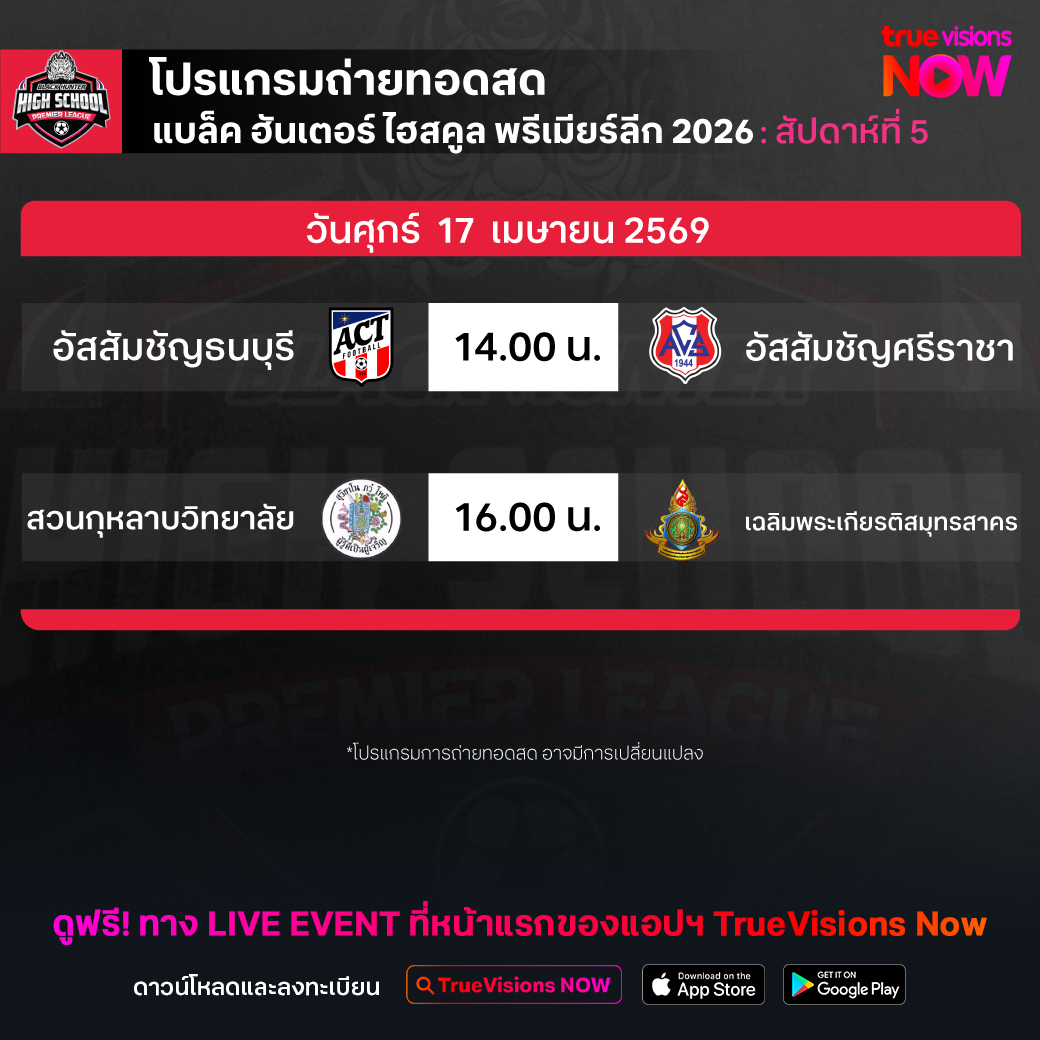 วันนี้มีอะไรดูที่ ทรูวิชั่นส์ ประจำวันศุกร์ที่ 17 เมษายน 69 ยังคงมีกีฬาที่น่าสนใจให้ได้ตามลุ้นตามเชียร์กันเหมือนเดิม โดยในส่วนของฟุตบอลยังมีศึก บุนเดสลีกา เยอรมนี, กัลโช่ เซเรีย อา อิตาลี, ลีกา 2 เยอรมนี และ เอ-ลีก ออสเตรเลีย รวมถึง ฟุตบอลนักเรียน แบล็ค ฮันเตอร์ ไฮสคูล พรีเมียร์ลีก ให้ได้ตามเชียร์กันต่อ ส่วนกีฬาอื่นๆ ยังมี เทนนิสหญิง ดับเบิ้ลยูทีเอ ทัวร์ รายการ ปอร์เช่ เทนนิส กรังด์ปรีซ์, ลิฟ กอล์ฟ เม็กซิโก ซิตี้, เคแอลพีจีเอ ทัวร์ รายการ เน็กเซน เซนต์ ไนน์ มาสเตอร์ส, และ มวยไทย ดิ อัลติเมท มวยไทย เอ็กซ์พีเรียนซ์ งานนี้ ทรูวิชั่นส์ จัดเต็มให้ชมกันถึงบ้าน