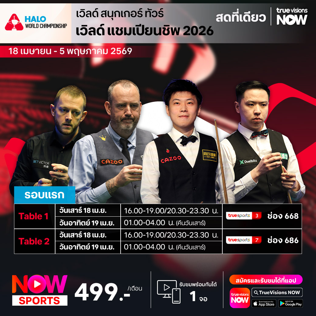 การรอคอยของแฟนๆ สิ้นสุดลงแล้ว เมื่อการแข่งขันที่ยิ่งใหญ่ที่สุดในประวัติศาสตร์ของกีฬาสนุกเกอร์ เดินทางมาถึง ครูซิเบิ้ล เธียเตอร์ ในเมืองเชฟฟิลด์ ประเทศอังกฤษ กับสนุกเกอร์ชิงแชมป์โลก หรือ เวิลด์ แชมเปี้ยนชิพ 2026 ที่จะเป็นการเปิดศึกของบรรดามือระดับสุดยอดของโลก โดยมีตำแหน่งแชมป์โลกเป็นเดิมพัน ร่วมสัมผัสประสบการณ์ที่สุดตื่นเต้น เร้าใจ เกมที่คู่คี่ สูสี ดวลคิวกันแบบมาราธอนใครนิ่ง ใครแม่น ใครจะผ่านความมกดดันระดับมหาศาลไปได้ ชมสด ครบทุกนาที ครบทุกแมตช์ ทุกรอบการแข่งขัน ที่ ทรูวิชั่นส์
