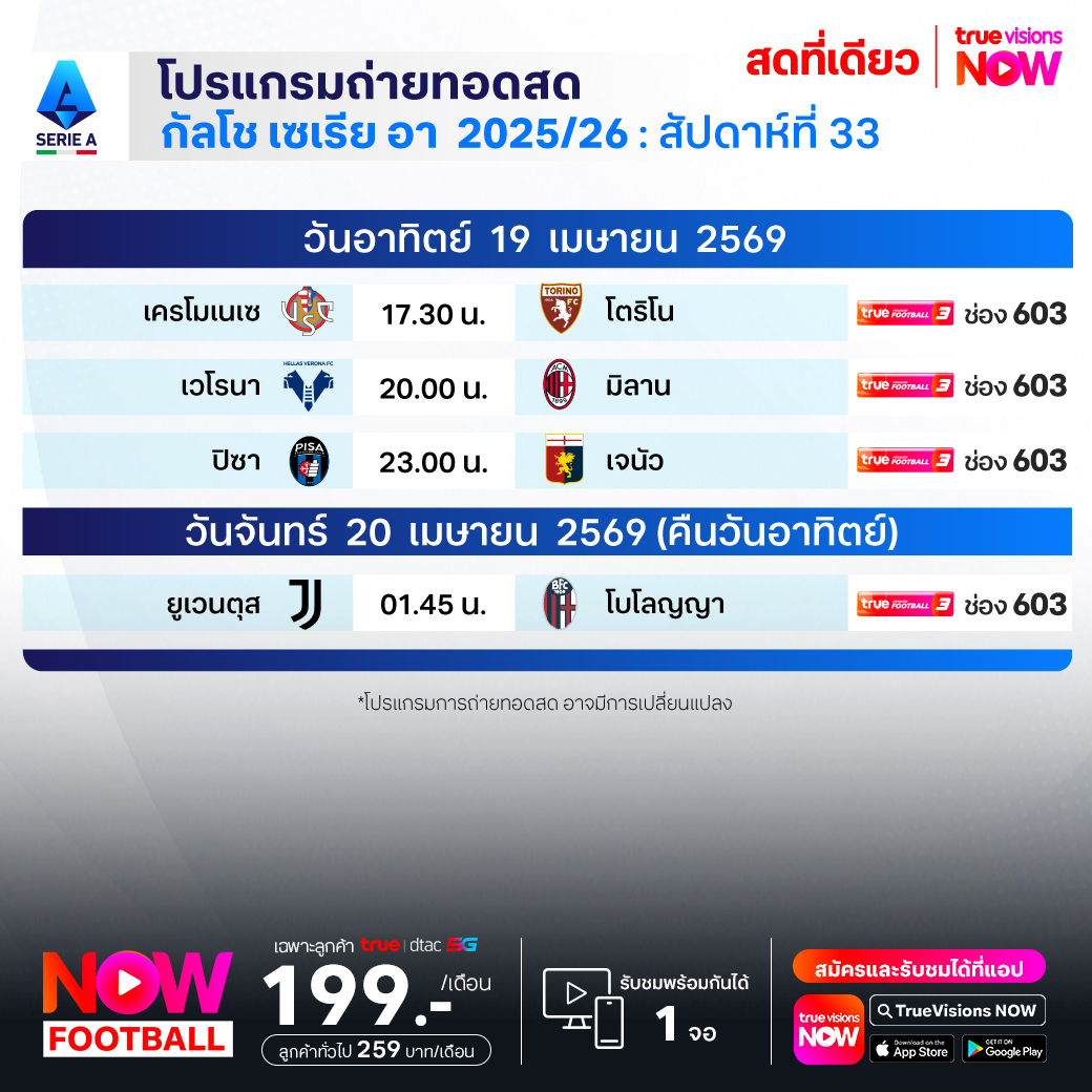 ปิซ่า พบ เจนัว เวลา 23.00-01.00 ทางช่อง TPF 3 (603)