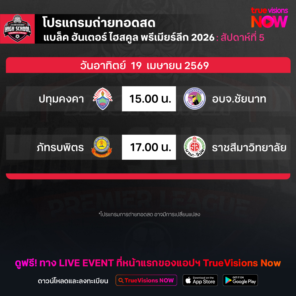 วันนี้มีอะไรดูที่ ทรูวิชั่นส์ ประจำวันอาทิตย์ที่ 19 เมษายน 69 ยังคงมีกีฬาที่น่าสนใจให้ได้ตามลุ้นตามเชียร์กันเหมือนเดิม โดยในส่วนของฟุตบอลยังมีศึก บุนเดสลีกา เยอรมนี, กัลโช่ เซเรีย อา อิตาลี, เอ-ลีก ออสเตรเลีย และ ฟุตบอลนักเรียน แบล็ค ฮันเตอร์ ไฮสคูล พรีเมียร์ลีก ให้ได้ตามเชียร์กันต่อ ส่วนกีฬาอื่นๆ ยังมี เทนนิสหญิง ดับเบิ้ลยูทีเอ ทัวร์ รายการ ปอร์เช่ เทนนิส กรังด์ปรีซ์, ลิฟ กอล์ฟ เม็กซิโก ซิตี้, เลดี้ส์ ยูโรเปี้ยน ทัวร์ รายการ โจเบิร์ก เลดี้ส์ โอเพ่น, เคแอลพีจีเอ ทัวร์ รายการ เน็กเซน เซนต์ ไนน์ มาสเตอร์ส, เวิลด์ สนุกเกอร์ ทัวร์ รายการ เวิลด์ แชมเปี้ยนชิพ, เมเจอร์ ลีก เบสบอล และ มวยไทย ดิ อัลติเมท มวยไทย เอ็กซ์พีเรียนซ์ งานนี้ ทรูวิชั่นส์ จัดเต็มให้ชมกันถึงบ้าน