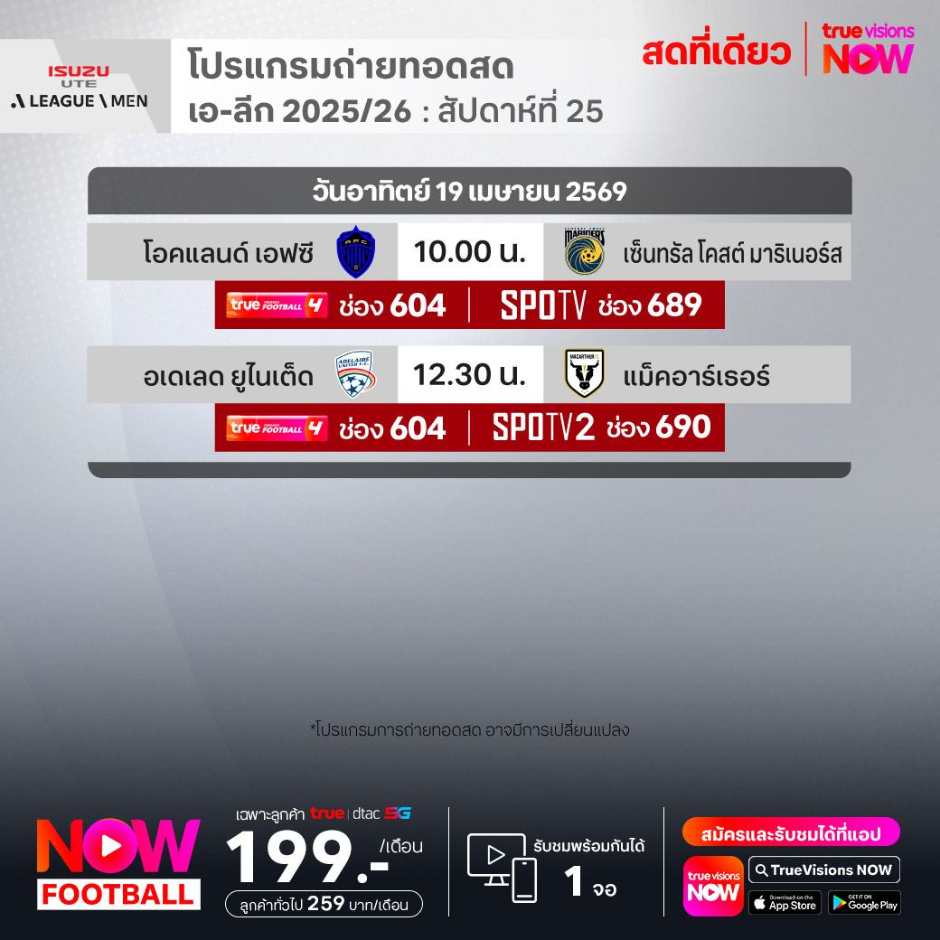 อเดเลด ยูไนเต็ด พบ แม็คอาร์เธอร์ เอฟซี เวลา 12.30-14.30 ทางช่องTPF 4(604) / SPOTV2 (690)