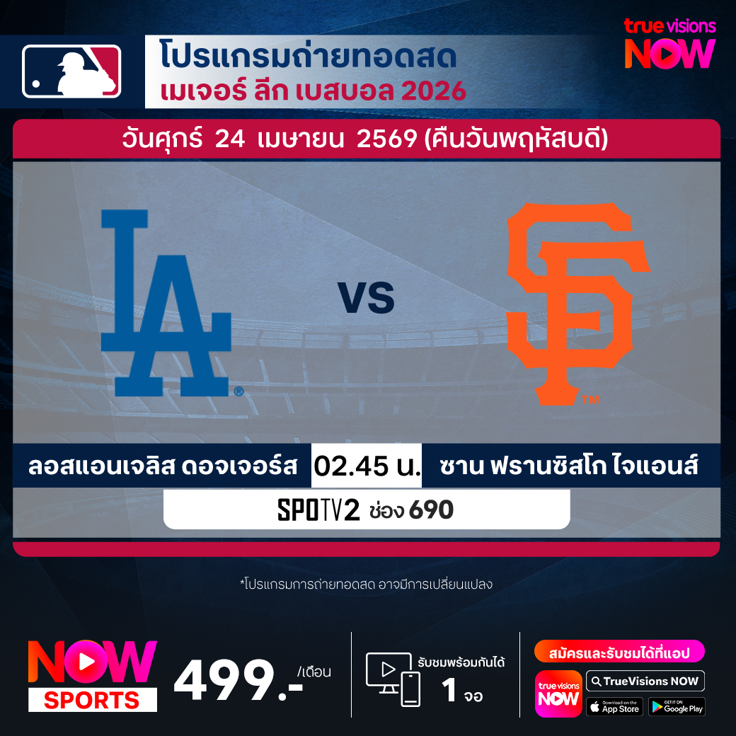 ลอสแอนเจลิส ดอจเจอร์ส พบ ซาน ฟรานซิสโก ไจแอนส์ เวลา 02.45 ทางช่อง SPOTV2 (690)