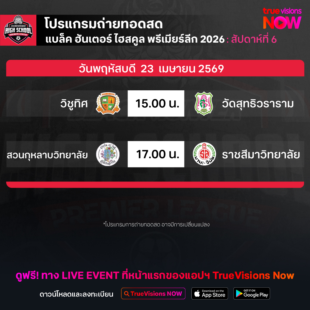 วันนี้มีอะไรดูที่ ทรูวิชั่นส์ ประจำวันพฤหัสบดีที่ 23 เมษายน 69 ยังคงมีกีฬาที่น่าสนใจให้ได้ตามลุ้นตามเชียร์กันเหมือนเดิม โดยในส่วนของฟุตบอลยังมีศึก ลา ลีกา สเปน, เดเอฟเบ โพคาล และ ฟุตบอลนักเรียน แบล็ค ฮันเตอร์ ไฮสคูล พรีเมียร์ลีก ให้ได้ตามเชียร์กันต่อ ส่วนกีฬาอื่นๆ ยังมี เทนนิสหญิง ดับเบิ้ลยูทีเอ ทัวร์ รายการ มาดริด โอเพ่น, กอล์ฟ เอเชียน ทัวร์ รายการ สิงคโปร์ โอเพ่น, เวิลด์ สนุกเกอร์ ทัวร์ รายการ เวิลด์ แชมเปี้ยนชิพ, เมเจอร์ ลีก เบสบอล และ มวยไทย ดิ อัลติเมท มวยไทย เอ็กซ์พีเรียนซ์ งานนี้ ทรูวิชั่นส์ จัดเต็มให้ชมกันถึงบ้าน
